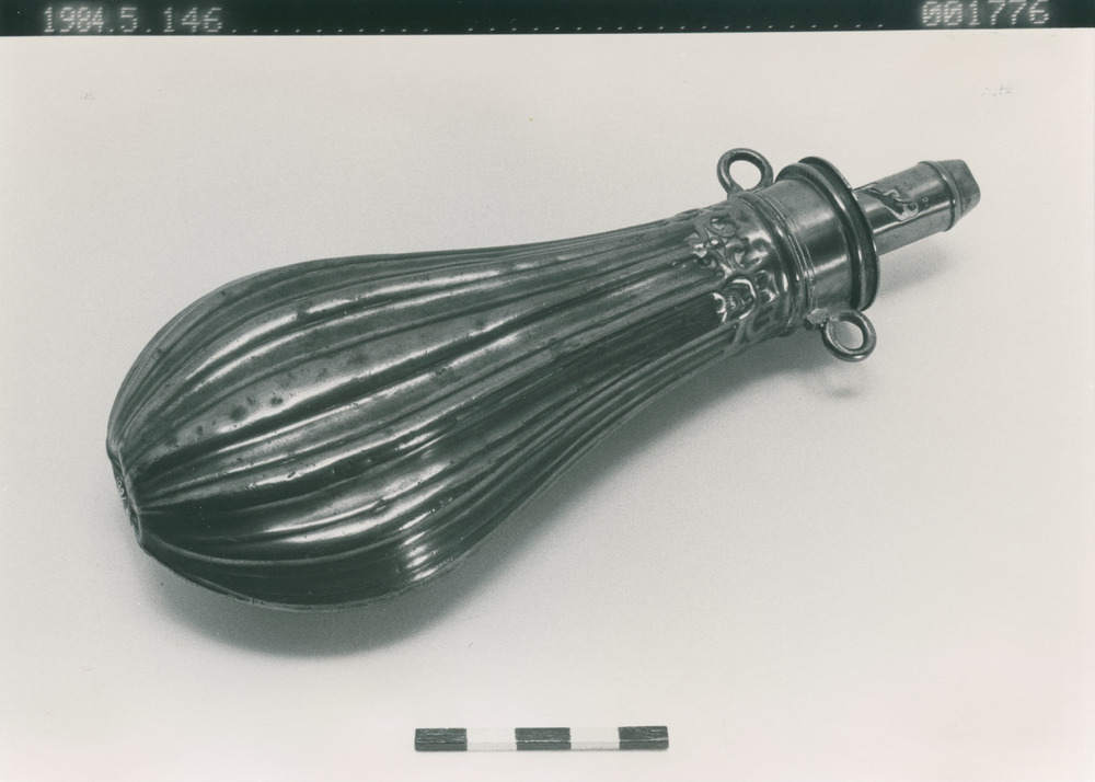 - Kruthorn av gul metall (mässing och/eller koppar) i form av en oval flaska med smal pip. Vid pipen två öron för remmar.