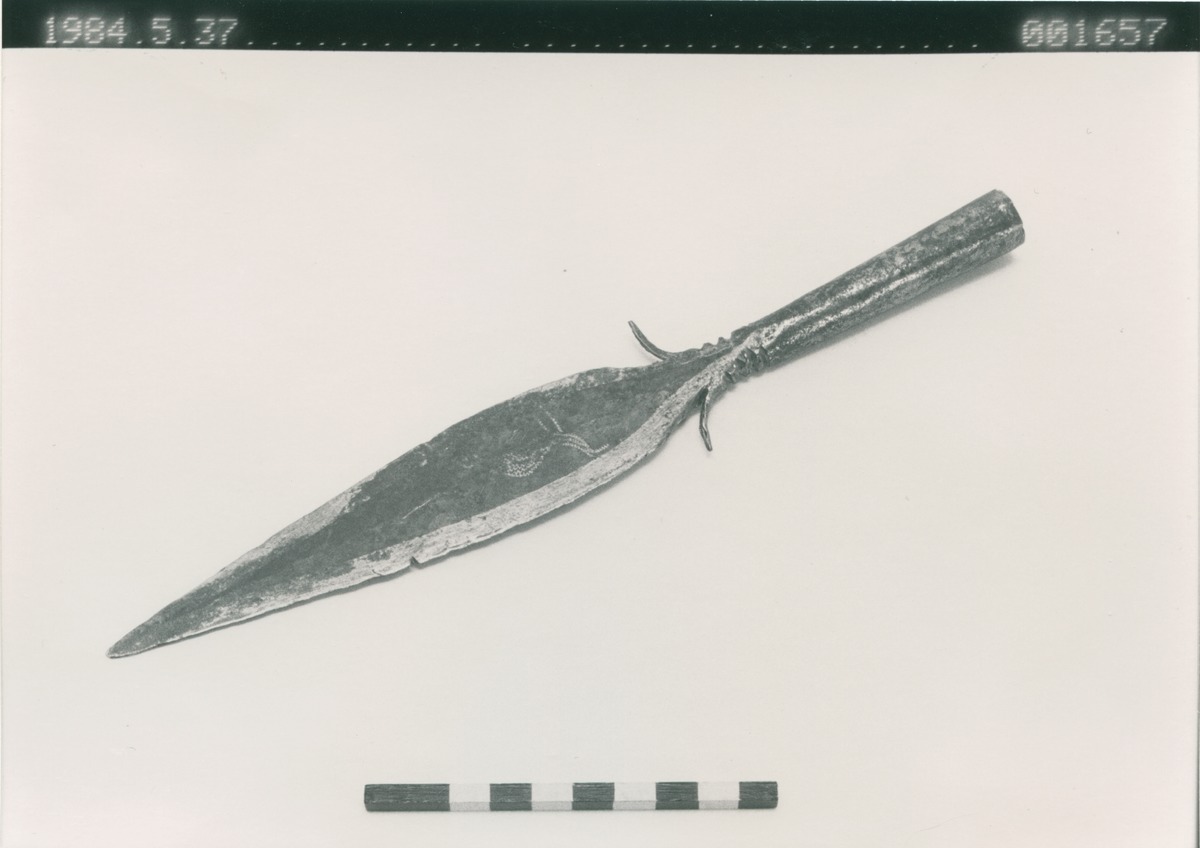 - Spjutspets med holk. Lancettformat blad med inristad dekor på bägge sidor; djur.