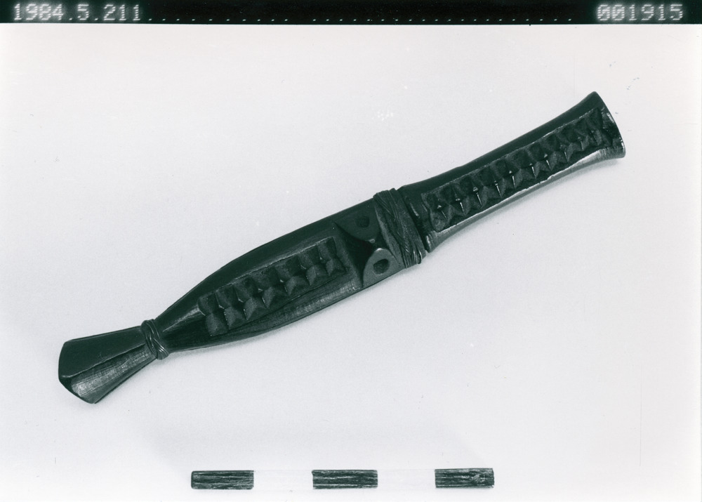 - Kniv? Tvådelat föremål som inte går att få isär, fastrostat blad? Snidat i mörkt trä. Skidan består av två delar; ovansidan mörk och mönstrad i relief, undersidan ljusare trä. Hål för snöre på ovansidan av skidan. Nedtill och upptill av skidan flätad metalltråd (silver?).