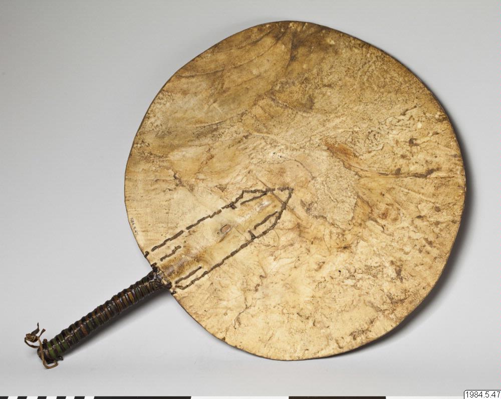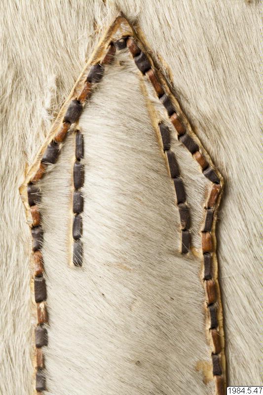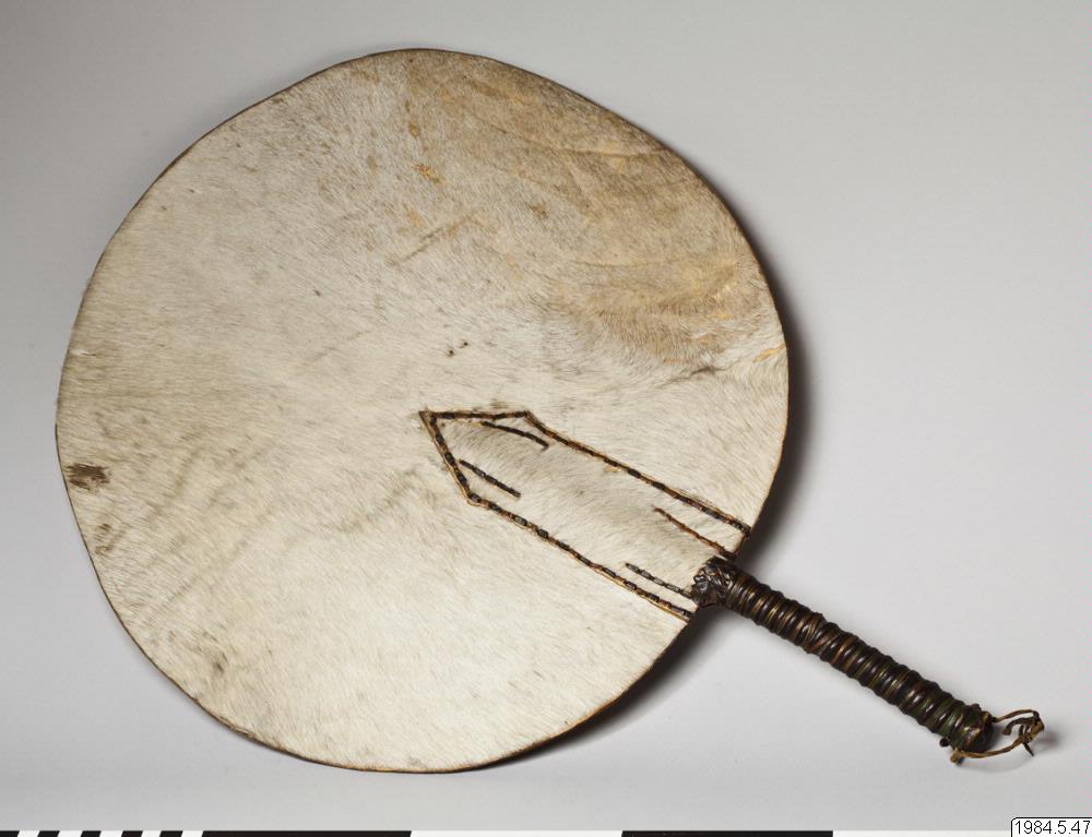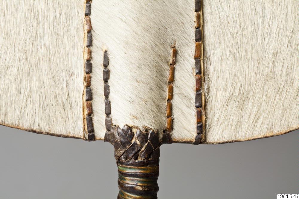 - Fläkta av skinn med pälsen kvar. Handtag av trä, lindat med skinnremsor och fastsytt vid fläktan med skinnremsor.