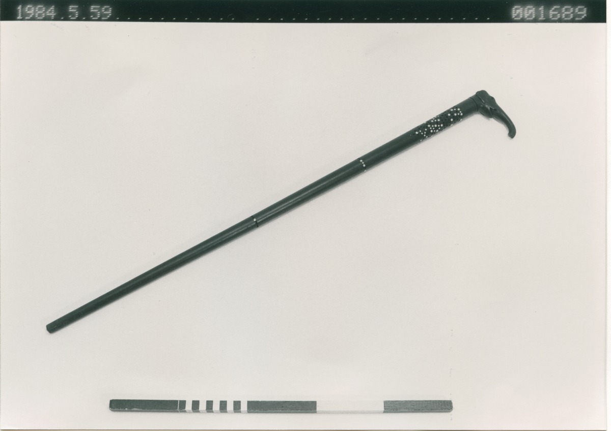 - Käpp av ebenholts med inläggningar av elfenben. Fastskruvad krycka snidad som ett elefanthuvud. Ögon och betar av elfenben. En bete saknas liksom många av de runda inläggningarna på käppen (2009-12-15).
