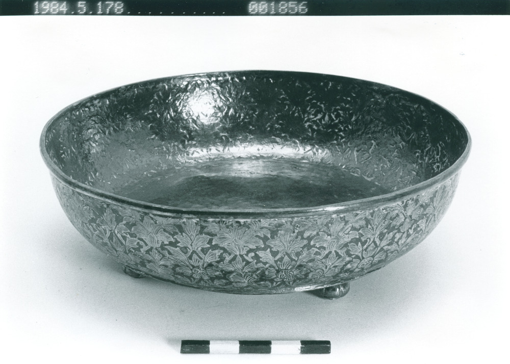 - Låg skål på fyra små runda fötter. Rikt dekorerad på in- och utsidan av kanten. Stämpel på undersidan av botten: "Bankok 1911".