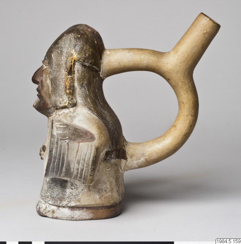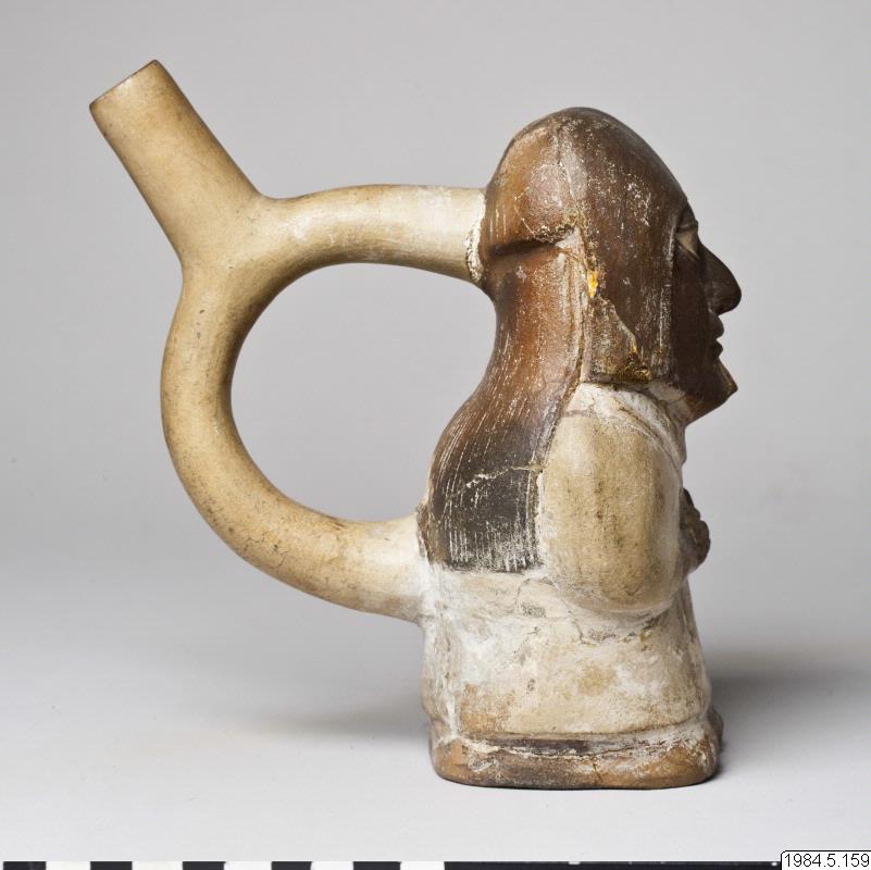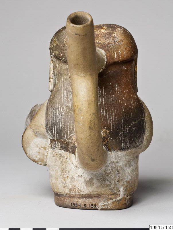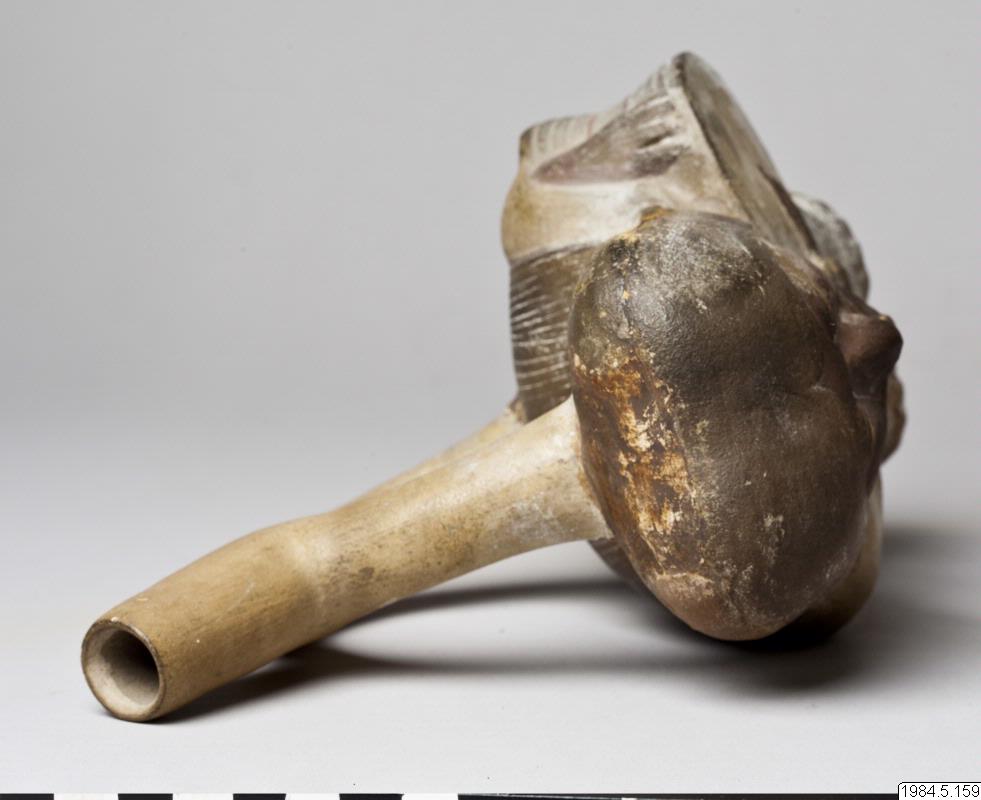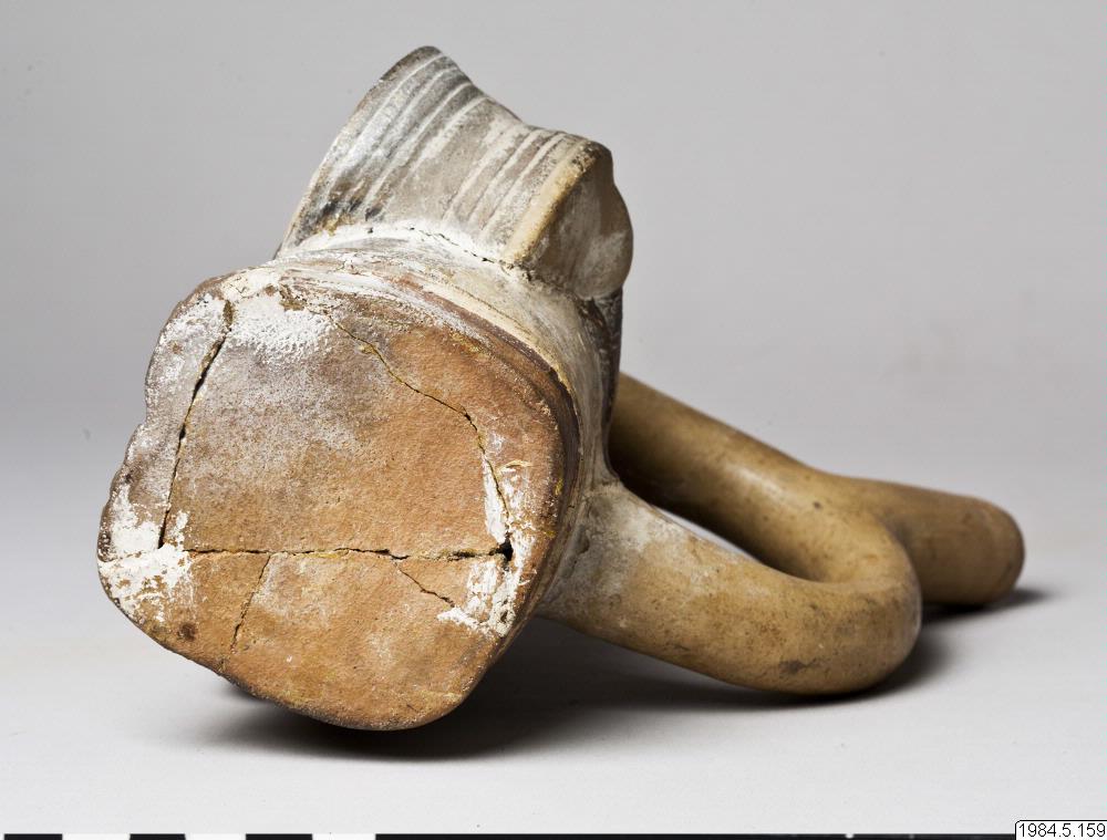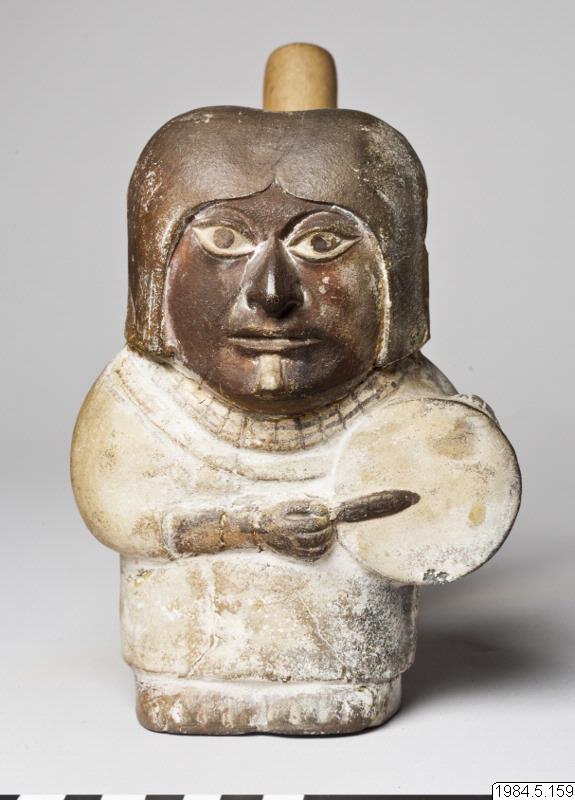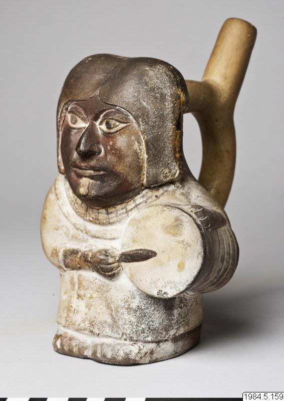 - Kärl, plastiskt med stigbygelformad pip. Motiv: en figur klädd i en ljus dräkt med halsband och långt svart hår. Figuren håller en trumma under vänster arm och slår på den med en trumpinne i höger hand.