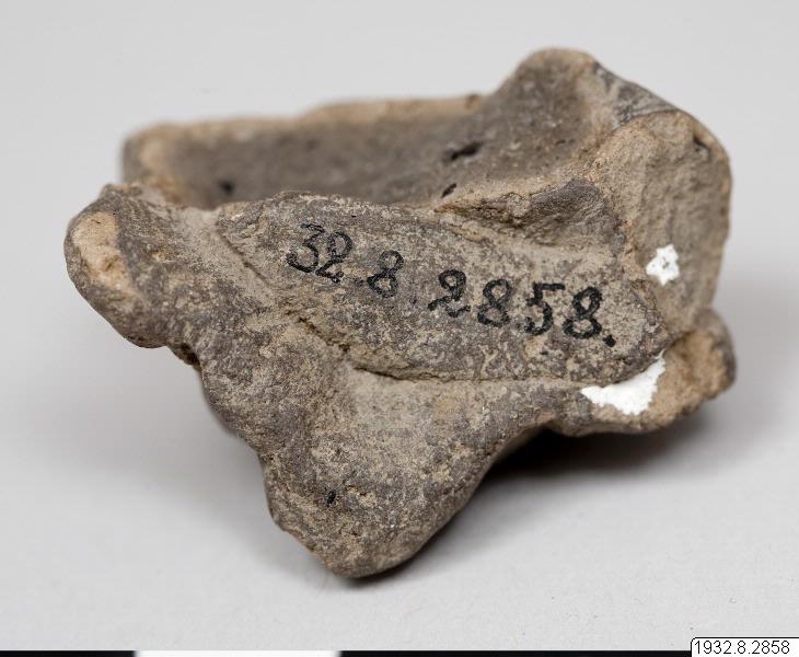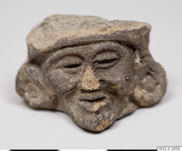 - Lerhuvud. Den gamle eldgudens skrynkliga ansikte. Har troligen varit karyatid och uppburit en låg, cylindrisk skål. (generalkatalogen)