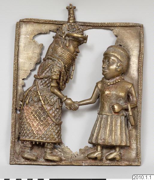 Plakett i brons som föreställer hur kung Akenzua II välkomnar Drottning Elizabeth II. 1956 kom drottning Elizabeth på statsbesök till den dåvarande brittiska kolonin Nigeria. Händelsen återgavs på några bronsreliefer precis som viktiga händelser tidigare hade registrerats på plaketter i palatsen. En version av händelsen pryder en vägg i kungens audiensrum och en annan finns hos en hög ämbetsman vid hovet. Denna version skänktes 2009 till Etnografiska museet. Den är gjord av bronsgjutarmästare Uyi Omodamwen (född 1974).