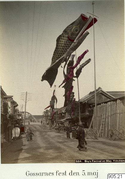 - Gatuscen från Yokohama, "Boys´s festival". Det finns många liknande bilder i andra japanska bildsamlingar från denna tid. Ett exempel är bilden på sidan 136 i Ulla Wagners bok "Det drömda Japan" (0112.j.0063.b). Antalet karpar visar hur många pojkar familjen har att fira.