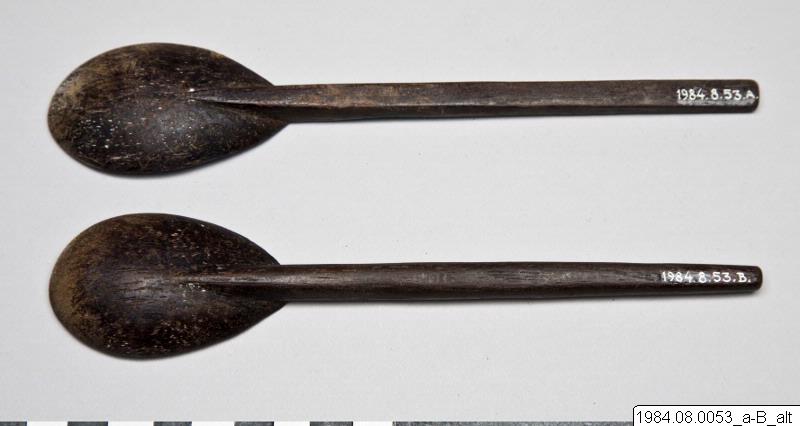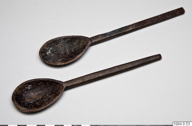 Skedarna är gjorda av mörkt trä. I själva skeden är det vitspräckliga (matrester?) och på A går skaftet precis innan skeden ett streck tvärs över. Något toppiga.