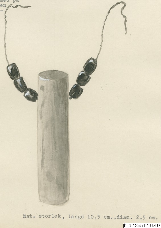 - En cylindörformad.slipad kvartssten. 2 cm från övre kanten är den genomborrad på tvärekoch.genoffi hålet går ett långt (C:a 90 cm) snöre av tucum-fiber med på vardera sidan om stenen tre påträdda "kikiga"-från. På ena sidan av cylindern, strax nedanför tvärhålet, synes en litue gropo tydligen början till ett liknande hål men som inte bor rats färdigt.' Längd: 1095 cm, diam.: 2,5 em. Se Koch-Ortinberg 1, fig. 206, sid. 327 Tueano