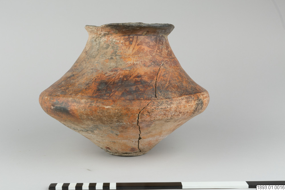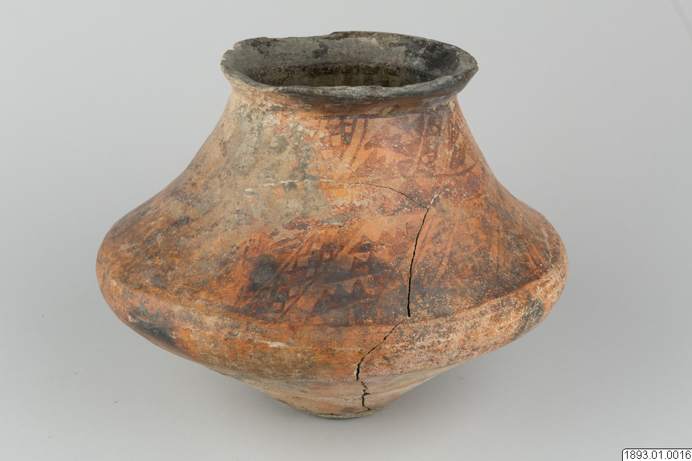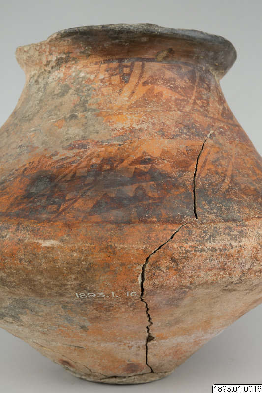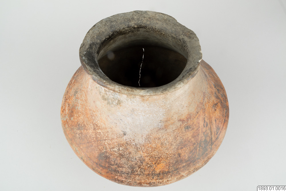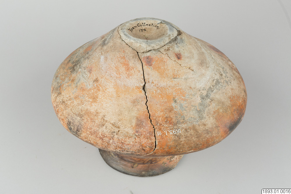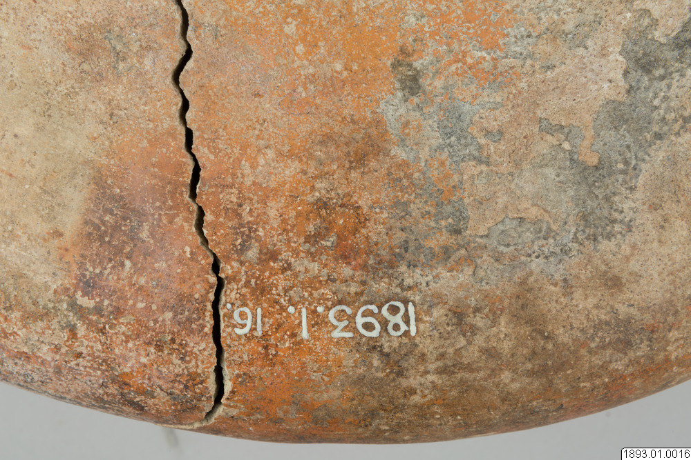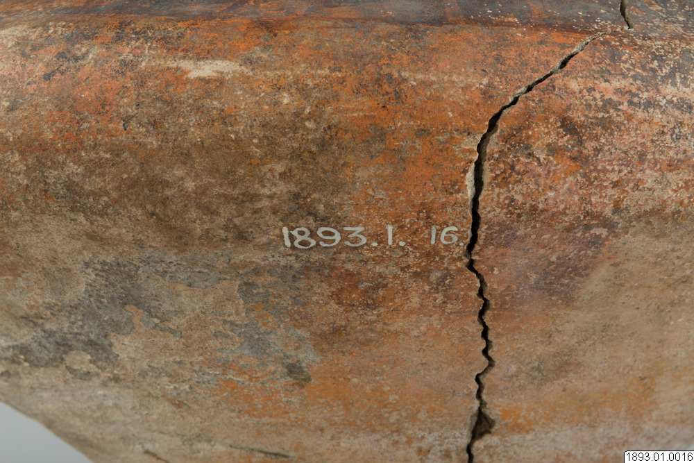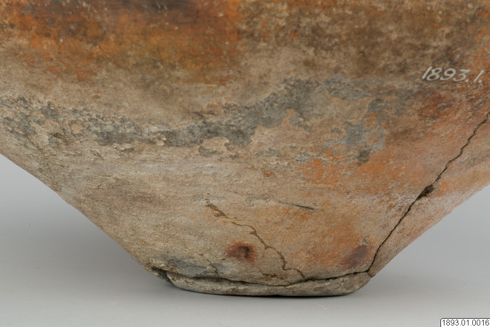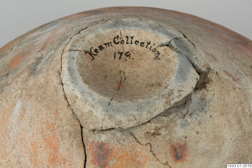 - Antik kruka av "orange ware". "Orange vare" är mycket sällsynt, endast några få föremål äro funna. Detta exemplar är det bästa i samlingen. Enligt Kidder mycket gammalt. (ark.) (Orig. nr. 1893.1. 15)