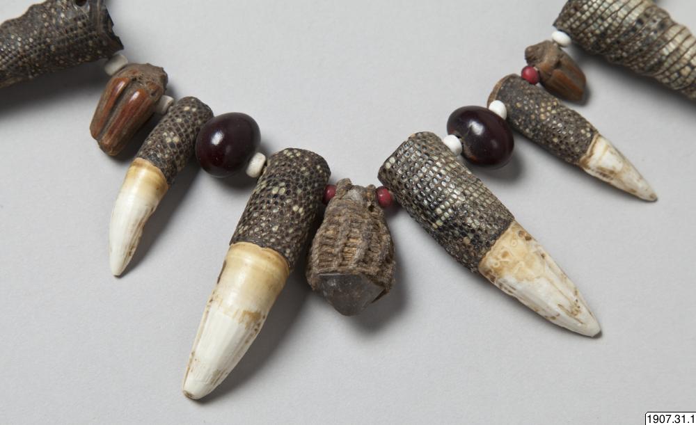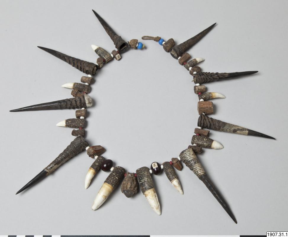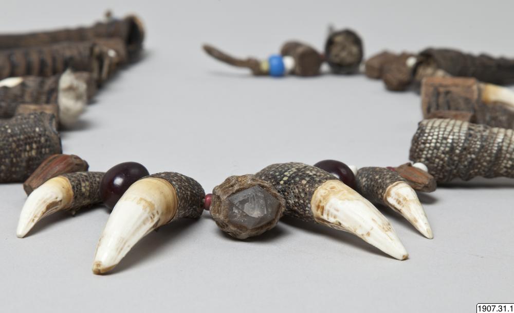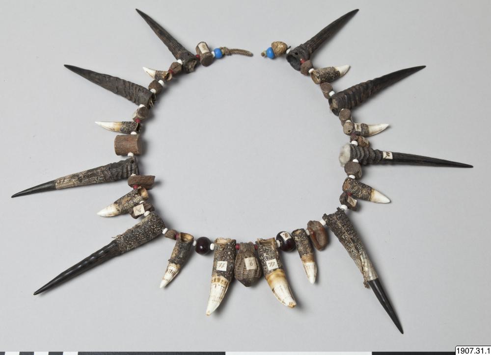 Zuluhalsband. De svarta hornen är-av "Impunsi", ett slags vildbock. De vita tänderna påstå de infödda vara "Imvene" (babian)tänder. En del av hornen och tänderna är för prydnads skull klädda med skinnet av "Uxamu" (en stor ödla).