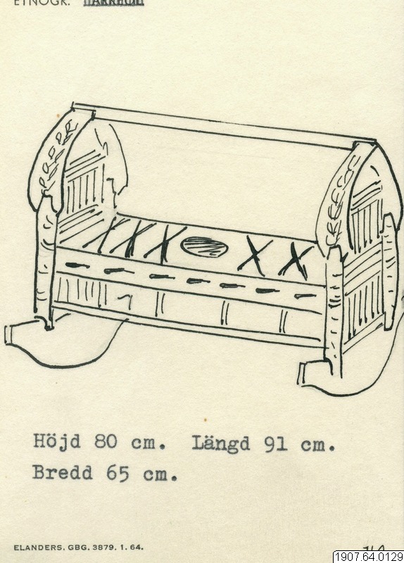 - 129. Vagga (besehir) Kopia.Kat,nr, 39. Av trä. I gavlarna ett svarvat spjälverk. Gavlarnas överkant i bågform och förenadeA längdriktningen, med en tvärslå. Mitt ibritsen en run&öppning, (jmf. nr 130.a.s.b). Målad i.blåtti rött och grönt. Höjd 80' Lähgd 91:.cm..Bredd,65