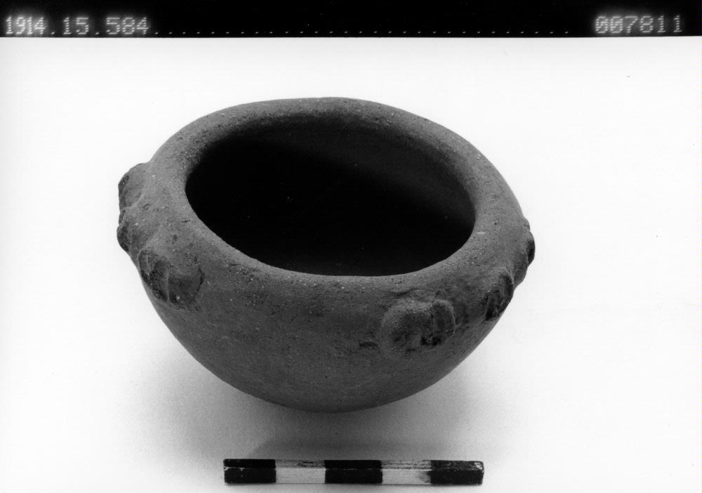 - Skål, enkel, dekor: 3 grupper knappar, tre-kluvna genom två vertikala fåror, 2 med tre knappar, en med två knappar. Höjd: 4.7 em. Diameter: 8.1 cm.