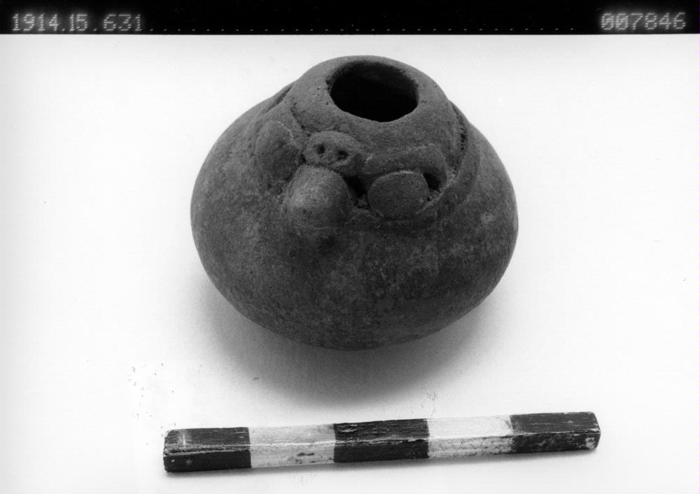 - Som föregående nr 630 men liten och utan inskuren dekor, samt vulst kring halsen. Höjd: 4 cm.. Diameter: 3.1 cm.