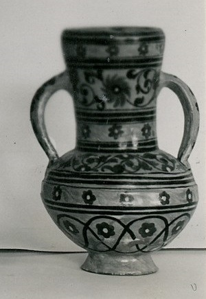 - Kruka. Blå bottenfärg med floristiska figurer i rödbrunt, svart, vitt och guld mellan svarta, runt om gående ränder. Höjd: 24 cm. Diameter: 14.8 cm. Foto.