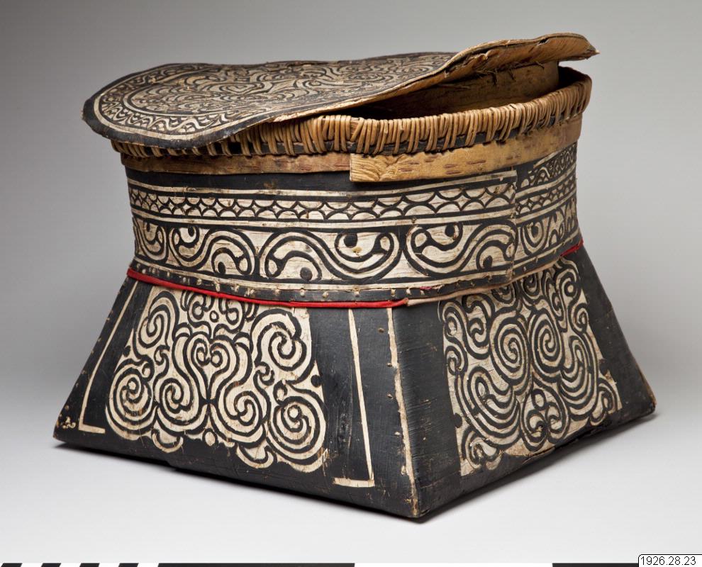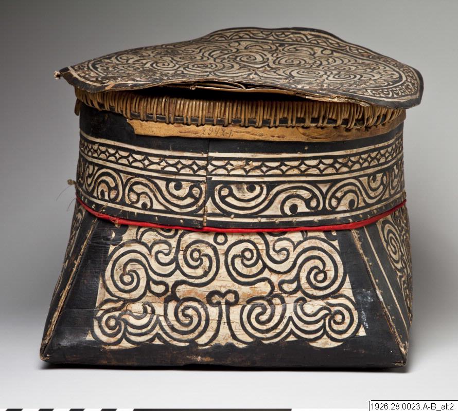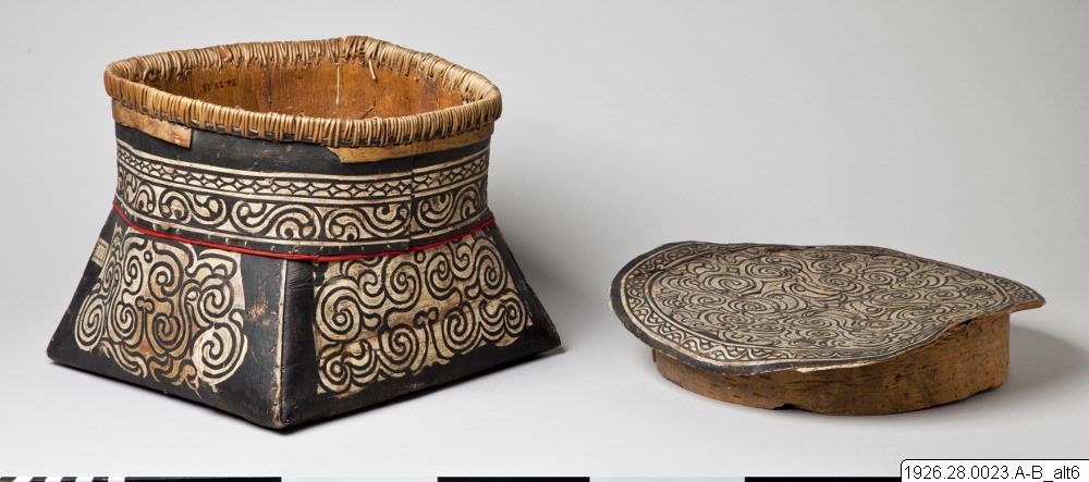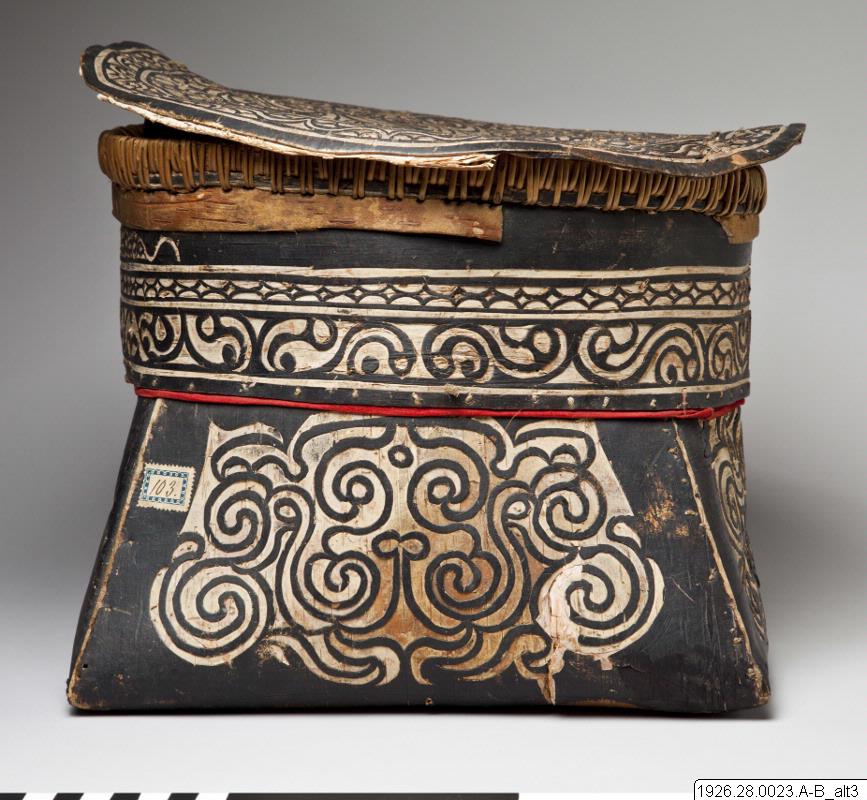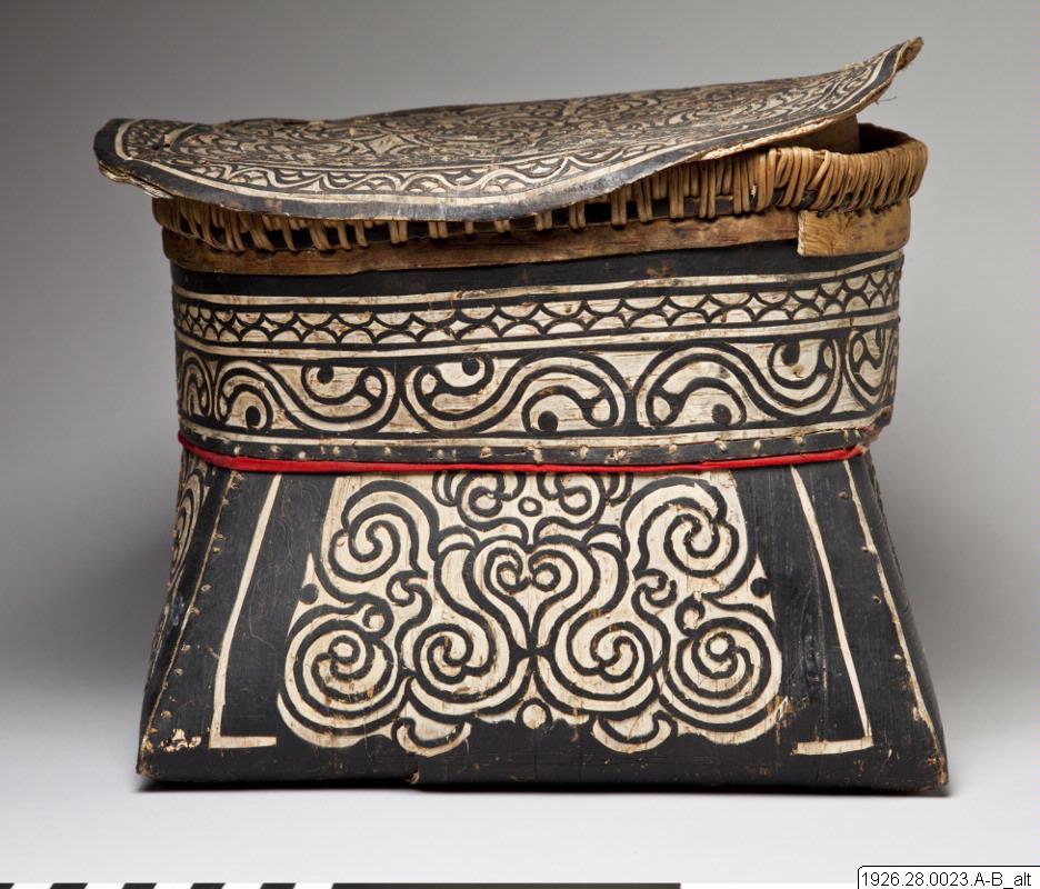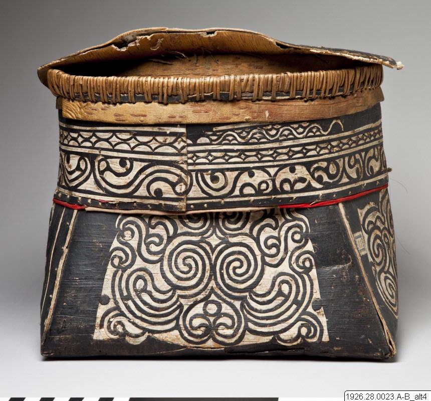 - Ask av björkbark med löst lock (B). Den övre hälften rund, den undre fyrkantig med kvadratisk bottenyta. Locket upptill, liksom askens sidor, rikt ornamenterade. Ornamentiken i svart relief på vit bakgrund.