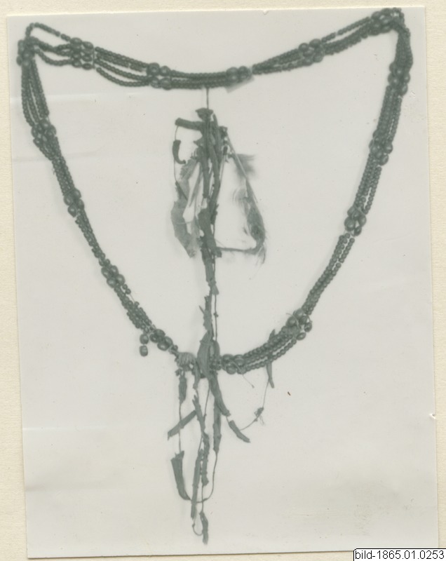 - Halsband av svarta och röda frön, fyrradigt och med raderna hopbundna av bomullstråd så att de röda fröna alltid komma i närheten av varandra. Tvärs över halsbandet äro tre bomullssnören dragna, vilka fasthålla dels en knippa numera helt malätna fjädrar och ett par bitar fågelskinn med rester av fjädrar och dels ett stort antal bitar av något slags bark, möjligen av en välluktande art. Längd: c:a 115 cm. Origpnr. 1065. ettbest.: Amazonas-omr