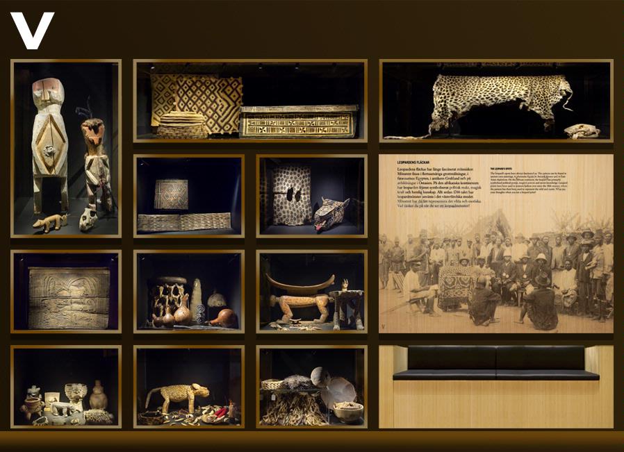 Fortsätt till monter V där vi har samlat föremål som föreställer leoparder och jaguarer eller gjorda av delar av de djuren.
