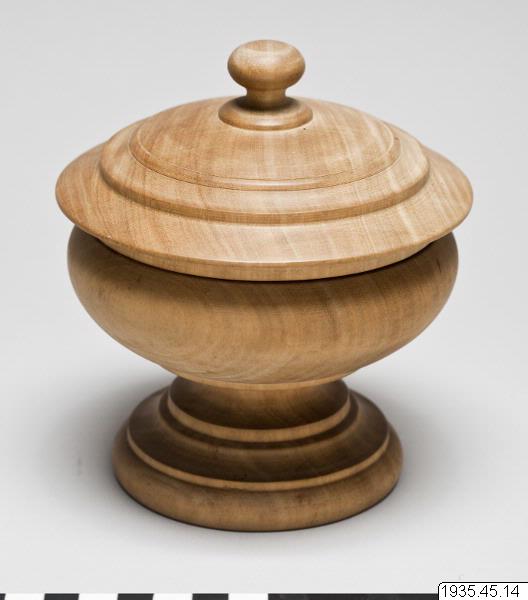 - Puderdosa. Vackert svarvarbete. Runda tämligen stora dosor på fot med lock som upptill utgår i en rund knopp, allt av trä.Tillverkad av samma person som gjort nr 10-13.(katalog)