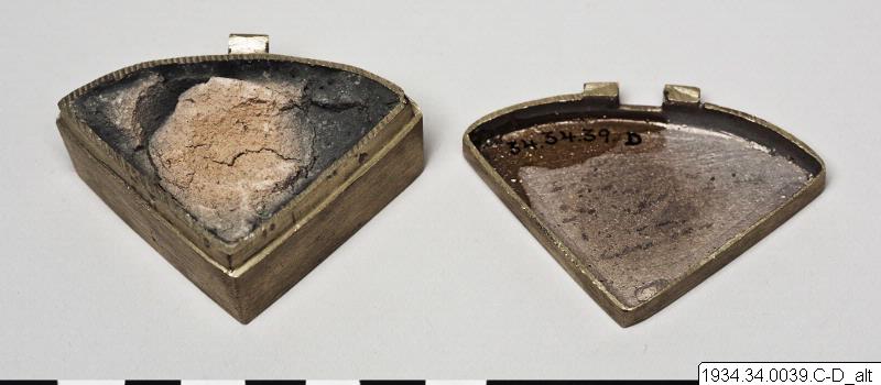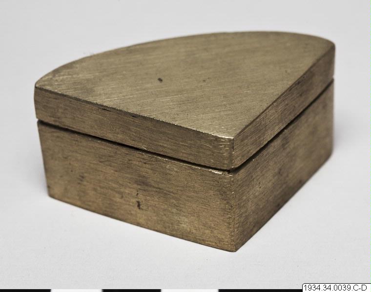 - Zinkask med lock. Innehåller betel. Triangelformad.