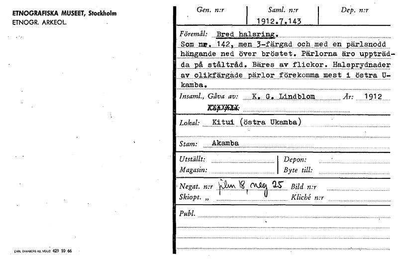 - Katalogkort ur Etnografiska museets arkiv.