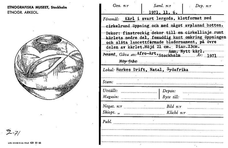 - Katalogkort ur Etnografiska museets arkiv.