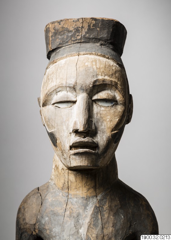 ; "En 135 cm hög snidad och målad träskulptur...utförd i en okonventionell stil...Den nutida staten Republiken Gabon fanns inte i slutet av 1800-talet och tidigare erfarenheter säger att termen användes i museisammanhang för ett stort och inte så noga avgränsat område i västra Centralafrika, söder om Biafrabukten (dagens Nigeria och Kamerun) och norr om Kongofloden. Föremålets proveniens är med andra ord inte särskilt väl dokumenterat.