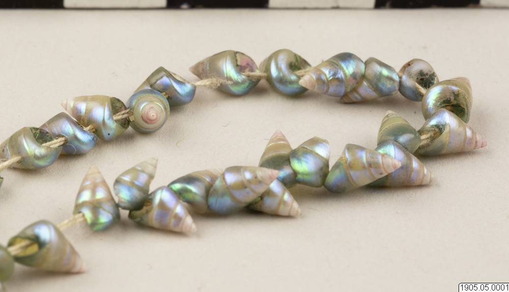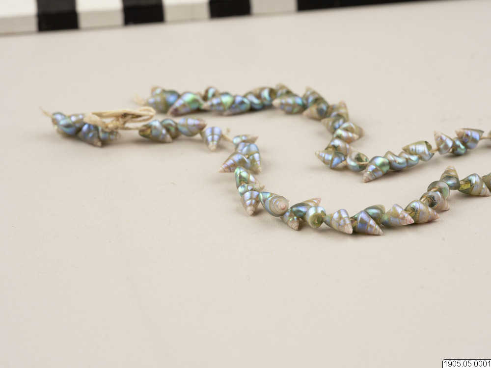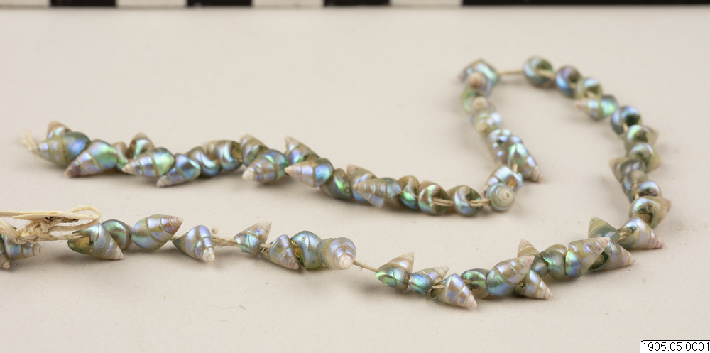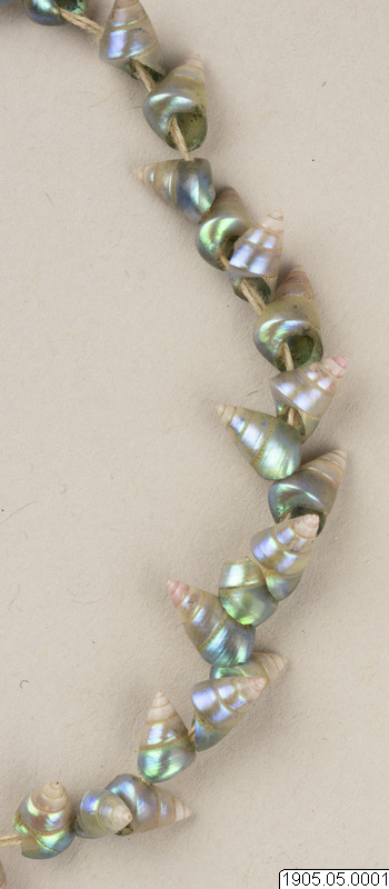 This early 19th century string of iridescent blue maireener shells comes from a long-time cultural tradition that spans hundreds of generations and is unique to Tasmanian Aboriginal people from the island of Tasmania, Australia. The practice of stringing maireener shells has been historically and contemporaneously carried out by Tasmanian Aboriginal women.