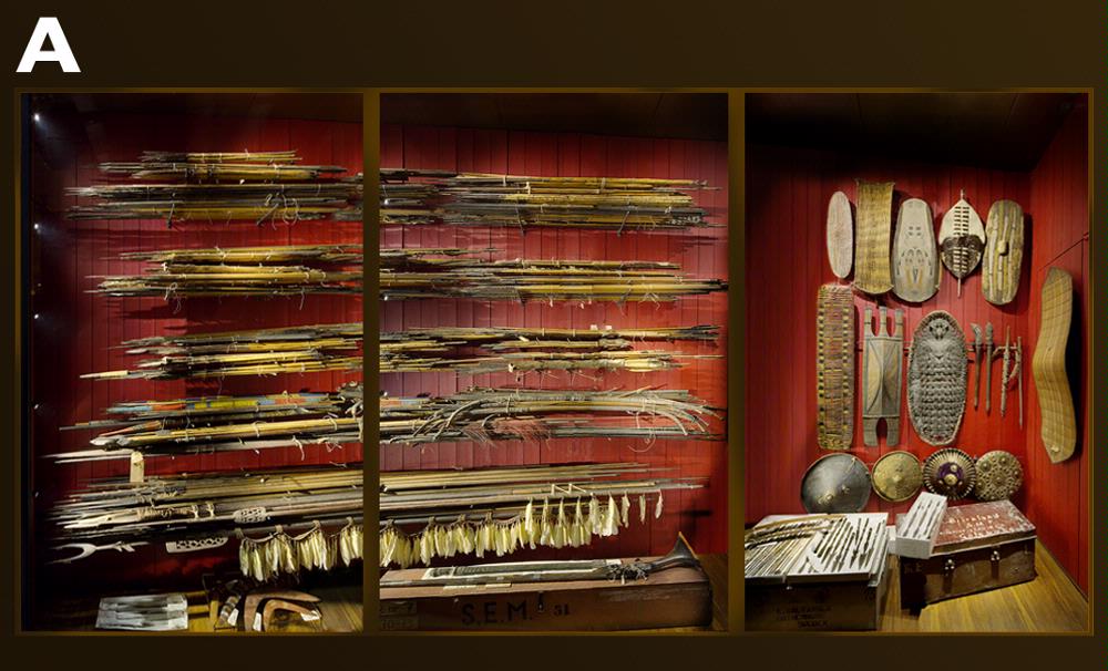 I museets magasin finns mer än 9000 pilar och spjut! Varför är de så många? Kanske kan insamlandet av pilar och vapen ses som ett slags avväpnande. I så fall är vapnen i montern också troféer och segerbyten.