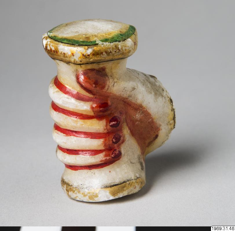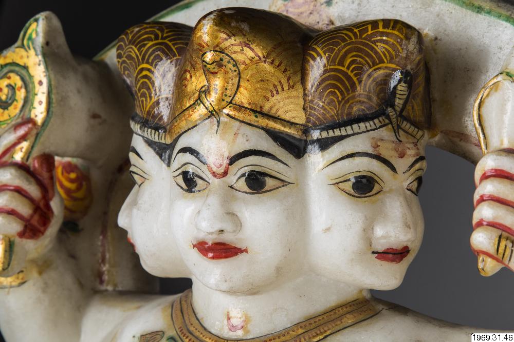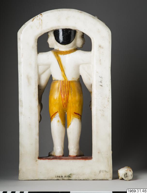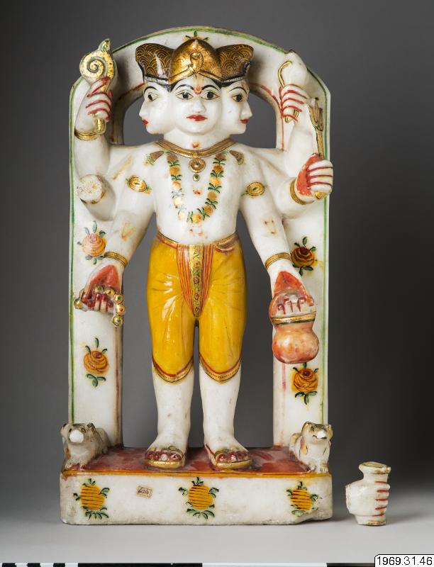 - Gudabild föreställande Brahma, gudafigur som är världens skapare inom hinduismen. Av marmor, polykromt målad. Ca 48 cm hög och 26.5 cm bred.