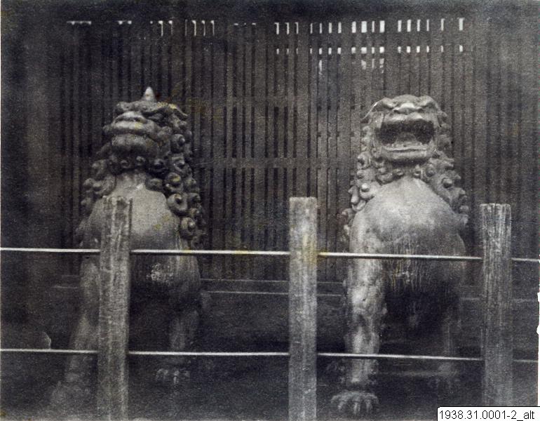 - Bild på de två väktarlejonen på plats i Japan innan de hamnade på Etnografiska museet, Stockholm.
