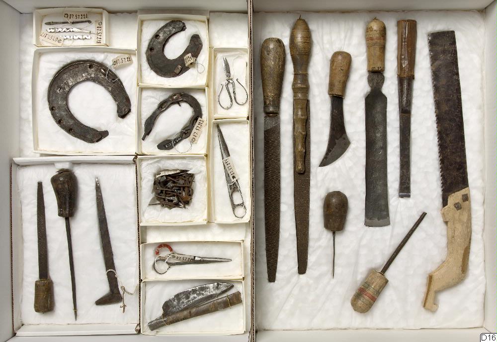 I Kashgar fanns hantverkare som tillverkade både sina egna verktyg och de som andra hantverkare behövde. Där erbjöds också verktyg importerade från Ryssland. I denna låda finner man barberarens saxar, sko- eller sadelmakarnas kniv, nål och pryl, den lokale doktorns kniv för åderlåtning, hovslagarens skor och sömmar för en åsna, snickarens såg, filar och rasp. Och ett litet städ - kanske för en juvelerare?