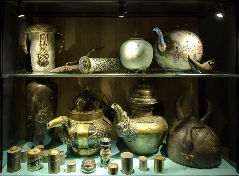 Drygt 20 olika föremål av metall, bland annat tekannor, kalkburkar, opiumaskar, sporrar och en huvudbonad i silver förvärvad under en av Sven Hedins expeditioner.