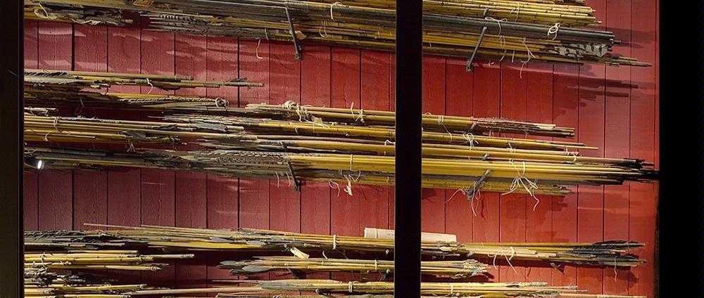 - På den andra hyllan uppifrån i mitten av vapenmontern finns 133 pilar av varierande längd och material.