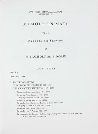 - Hedin, Sven, Ambolt, Nils & Norin, Erik (1967). Central Asia atlas. Memoir on maps, Vol. 1, Records on surveys. Stockholm: Sven Hedin foundation [Sven Hedins stift.], Etnografiska mus.