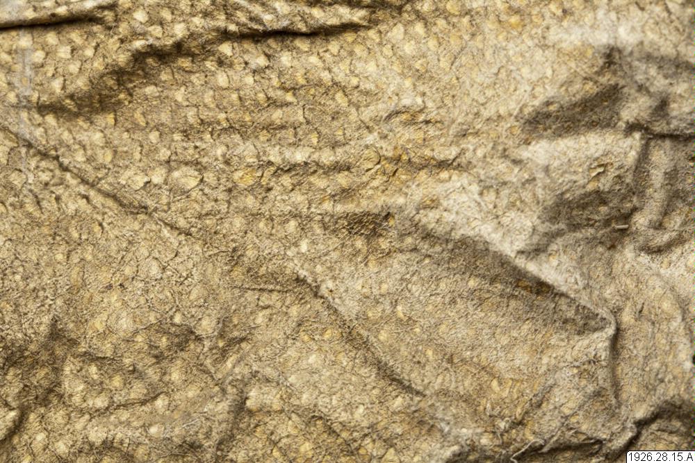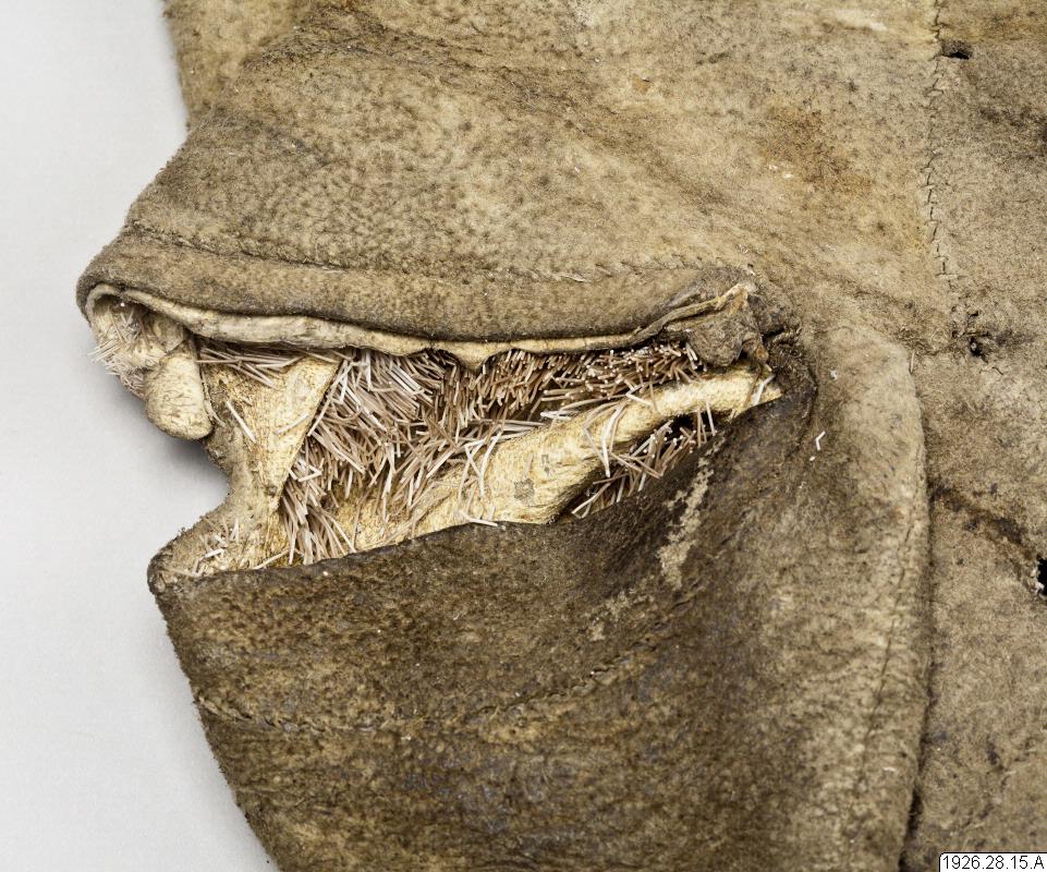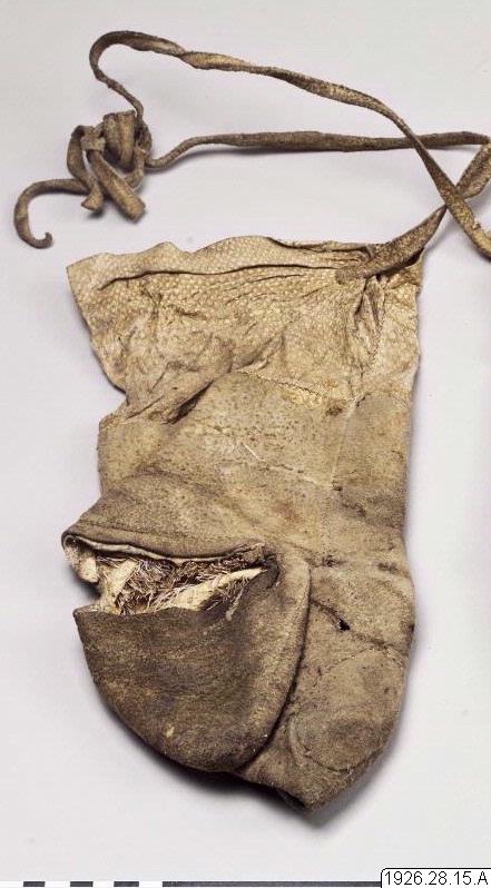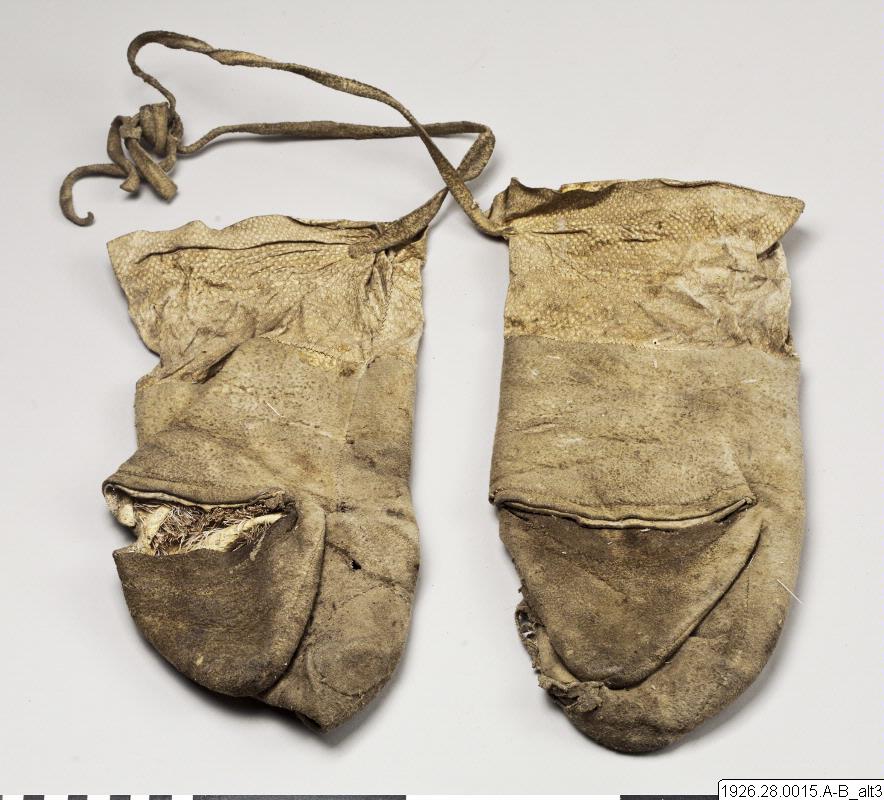 - Tumhandske av svinläder med borsten inåt och kragar av fiskskinn, vid vilka långa läderremmar är fästade, som förmodligen tjänar till att binda fast handskarna vid ärmarna. Nedtill vid tumhålet ett brett, vågrätt insnitt, genom vilket, om så erfordras, tummen kan sträckas fram.