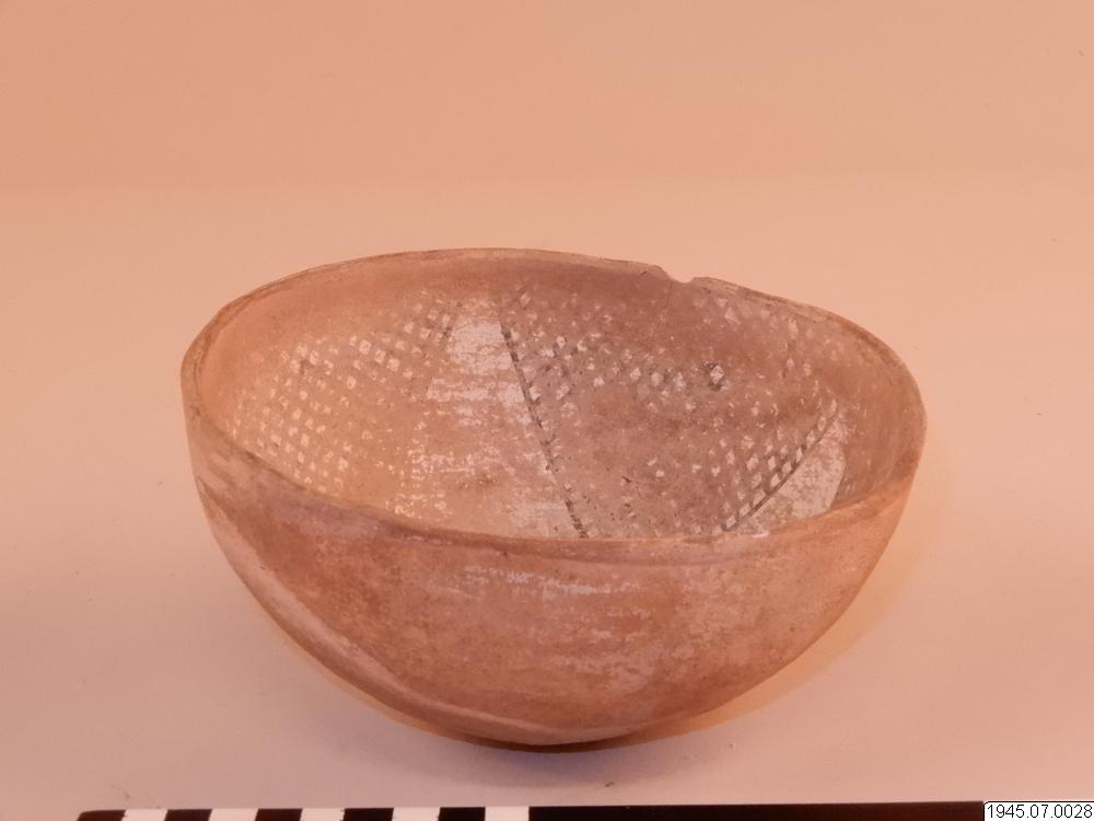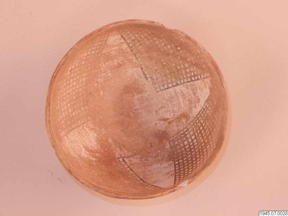 - Lerkärl. Sfärisk skål med, liksom de övriga, invändig dekor bestående av en 4-uddig stjärna, fälten mellan uddarna utfyllda med varandra skärande linjer; dekoren svart på vit botten. (generalkatalog)