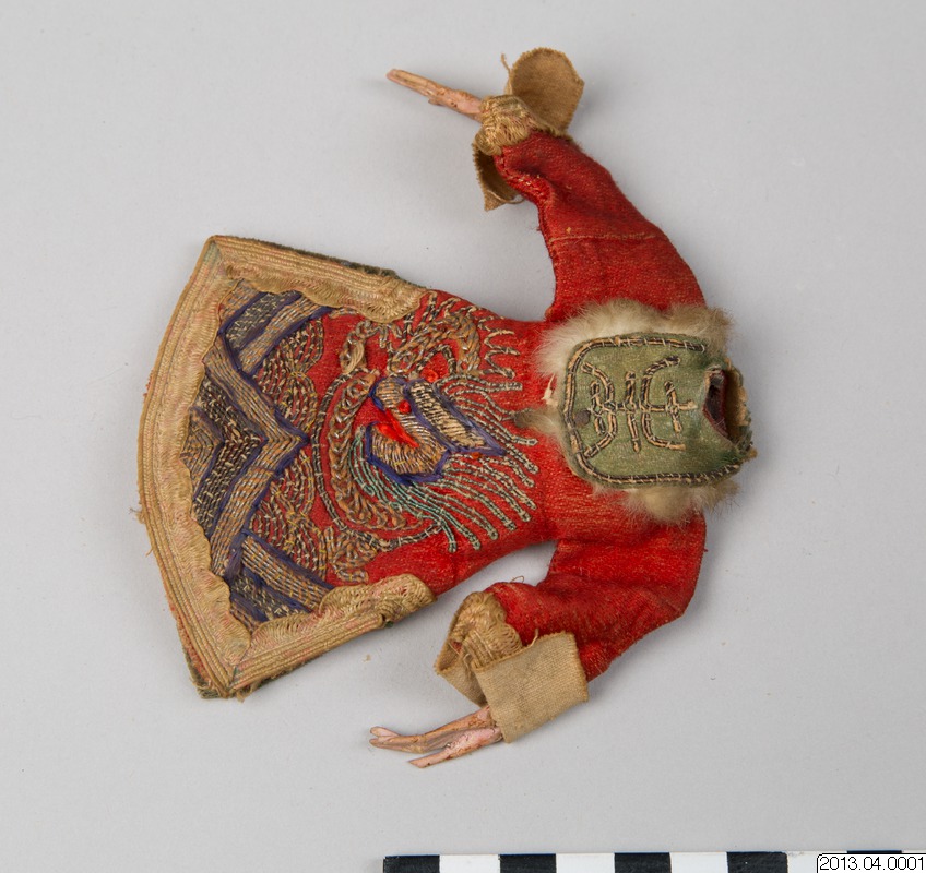 - Liten docka i röd, grön och ofärgad textildräkt. Dräktens ben är lila och vita. Omfattande broderad dekor och bröstparti utsmyckad med päls. Dockan saknar huvud och ben, men har armar och händer. Händerna är i pressat och bemålat papper.