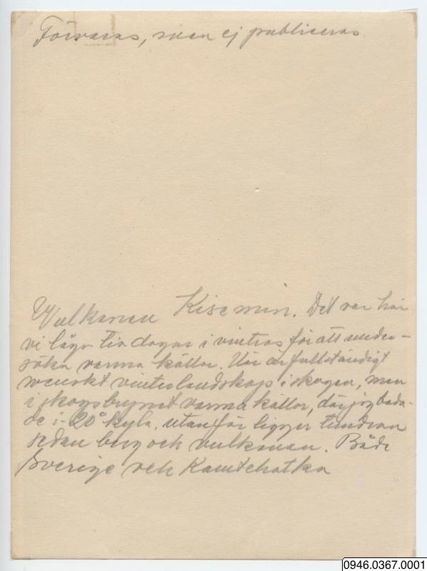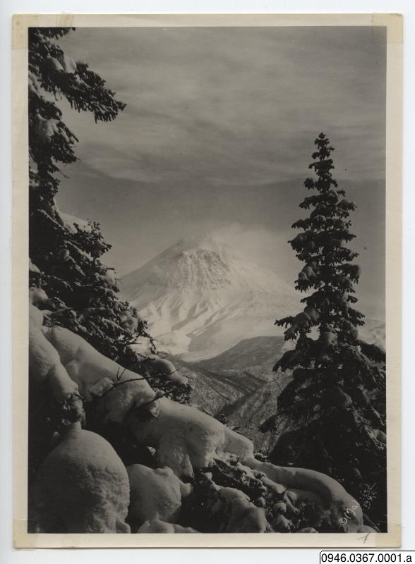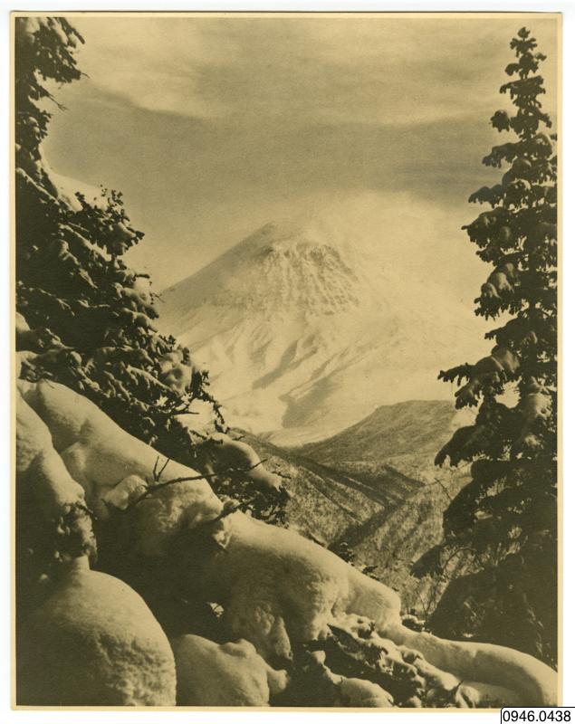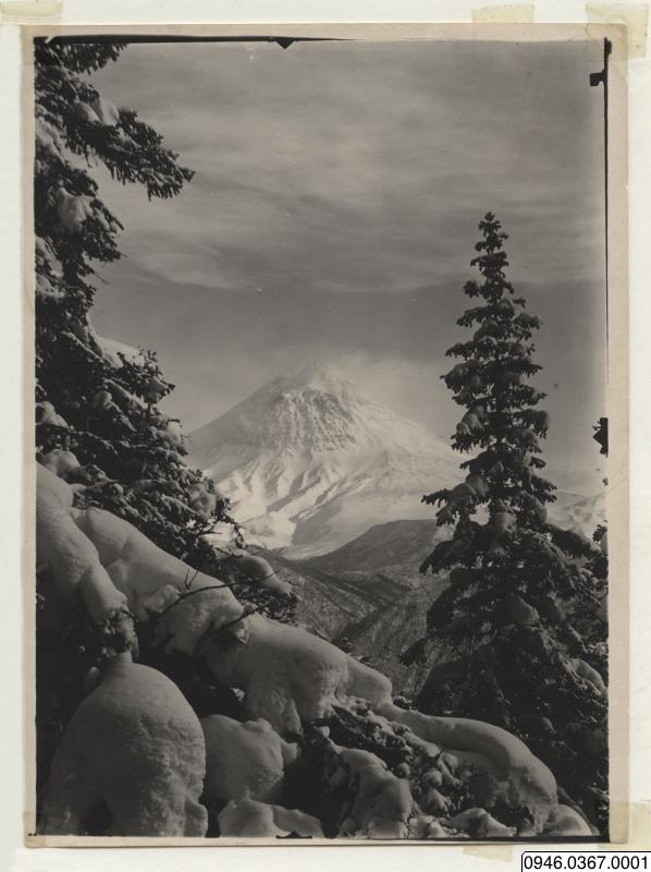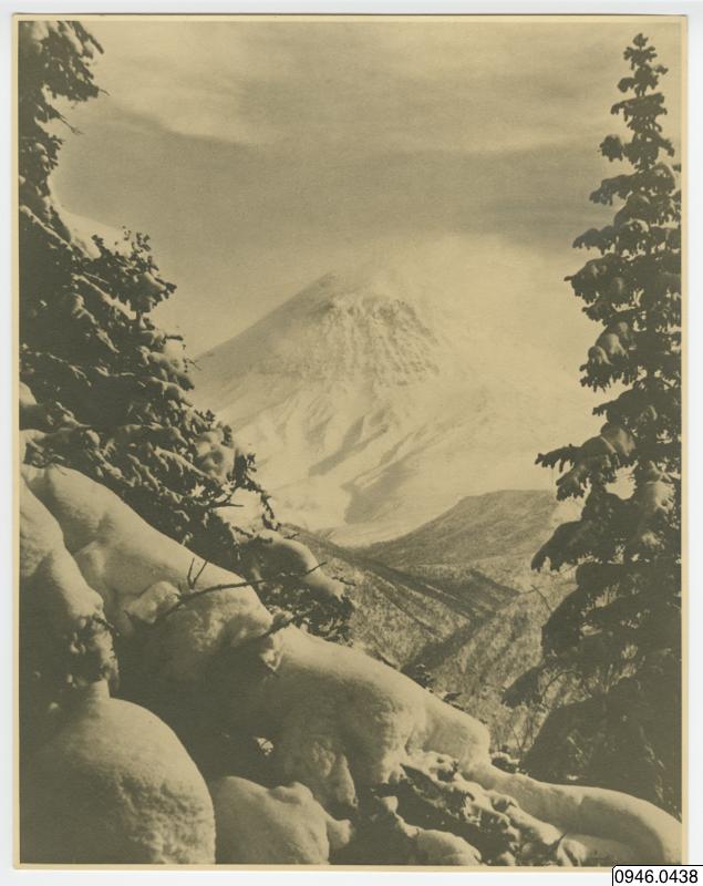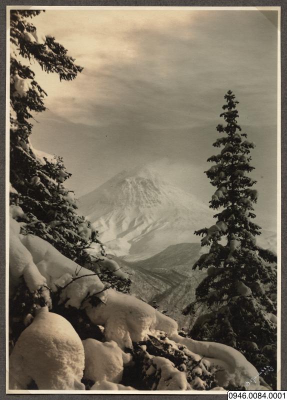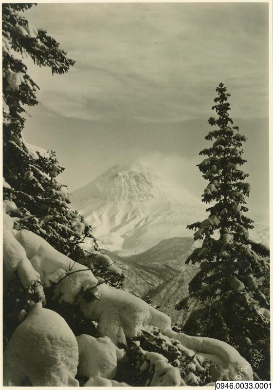 Vulkanen Kizimen (Kisimen, på ryska: Кизимен). 1924-29. Vy över vulkan med snötyngda granar i förgrunden. Antecknat på baksida av Sjöblom: "Det var här vi låg tio dagar i vintras för att undersöka varma källor. Här är fullständigt svenskt vinterlandskap i skogen, men i skogsbrynet varma källor, där jag badade i 20° kyla. Utanför ligger tundran nedan berg och vulkaner",