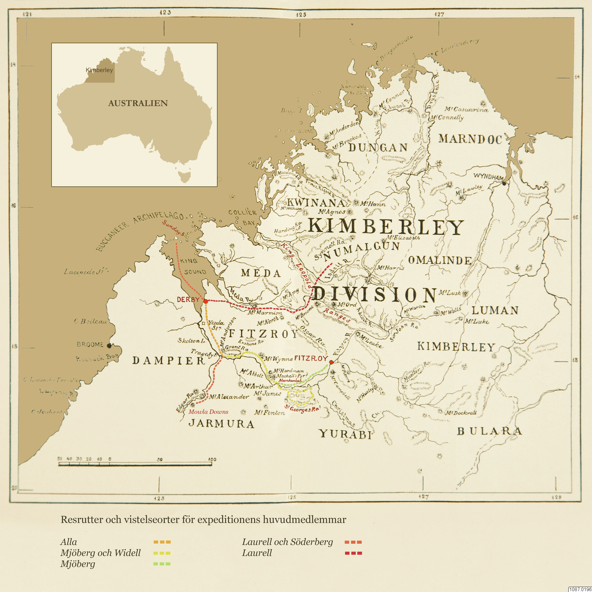 Först gjordes ett besök hos mangula-stammen (i de torra ökentrakterna ett 80-tal mil söder om Fitzroy River). Under två månaders tid gjordes här intressanta studier och samlingar... I början av januari 1911 företog Laurell en andra färd till en liten ögrupp ca 70 mil nv ut från Derby, de s.k. söndagsöarna.