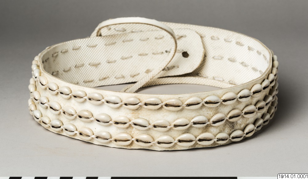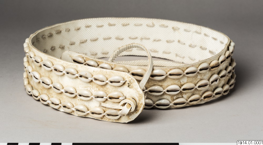 Kvinnobälte med tre rader kaurisnäckor fastsydda på bälte av mjukplast. Från byn Sibou, nära marknadscentret Tot i Marakwet District, Kenya. Tillverkad av Kokiptoo/Paulina 55-60 år. Betydelsen och funktionen av den här bältestypen finns beskriven i boken "Nyttan av en halv kalebass. Berättelser om föremål från Afrika" Wilhelm Östberg, (s29-32).Just det här bältet skiljer sig då det är tillverkat av kraftigt mjukplastband som Kokiptoo förvärvade från tefabrikerna i Kericho.(WÖ 2013)