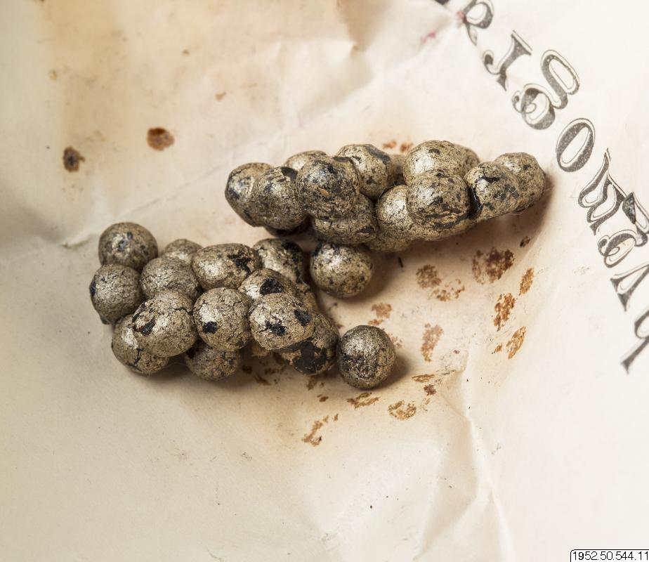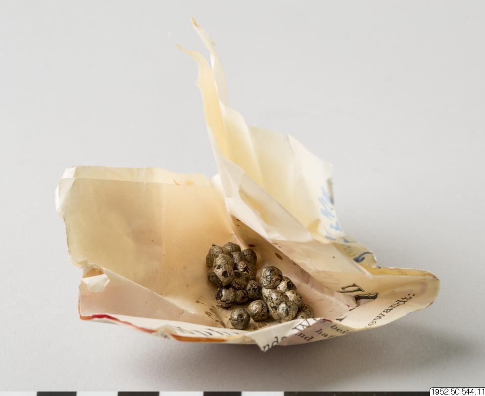 Kulor i mässingsfärg 5 mm bredd. Innehåller svart preparat. Några lösa och några fastklistrade i varandra. Går ej att identifiera vad detta är. Kulorna är inslagna i en bit tidningspapper.