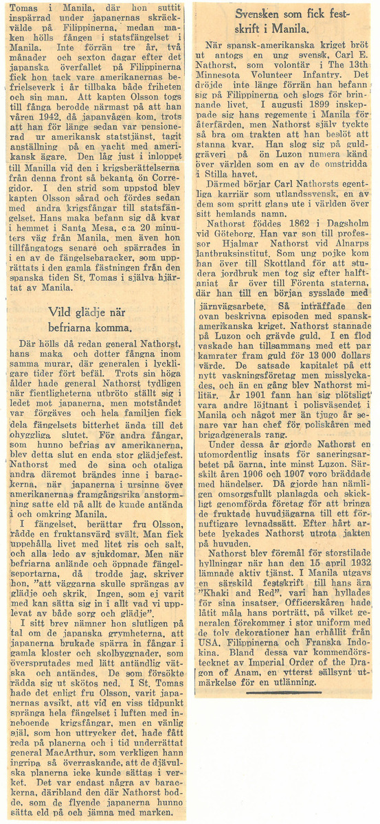 Det är makan till kapten Olsson, fru Alma Olsson, som i ett brev till en stockholmsdam, änka efter en annan bekant Filippinsvensk, sjökapten Carl Rydell, berättar om utståndna fasor och om familjen Nathorsts tragiska öde. Utom den 82-årige brigadgeneralen blev hans maka och enda dotter innebrända när amerikanerna i början av detta år hade befirat Manila. Brevet är daterat ti fängelset St. Tomas i Manila, där hon suttit irspärrad