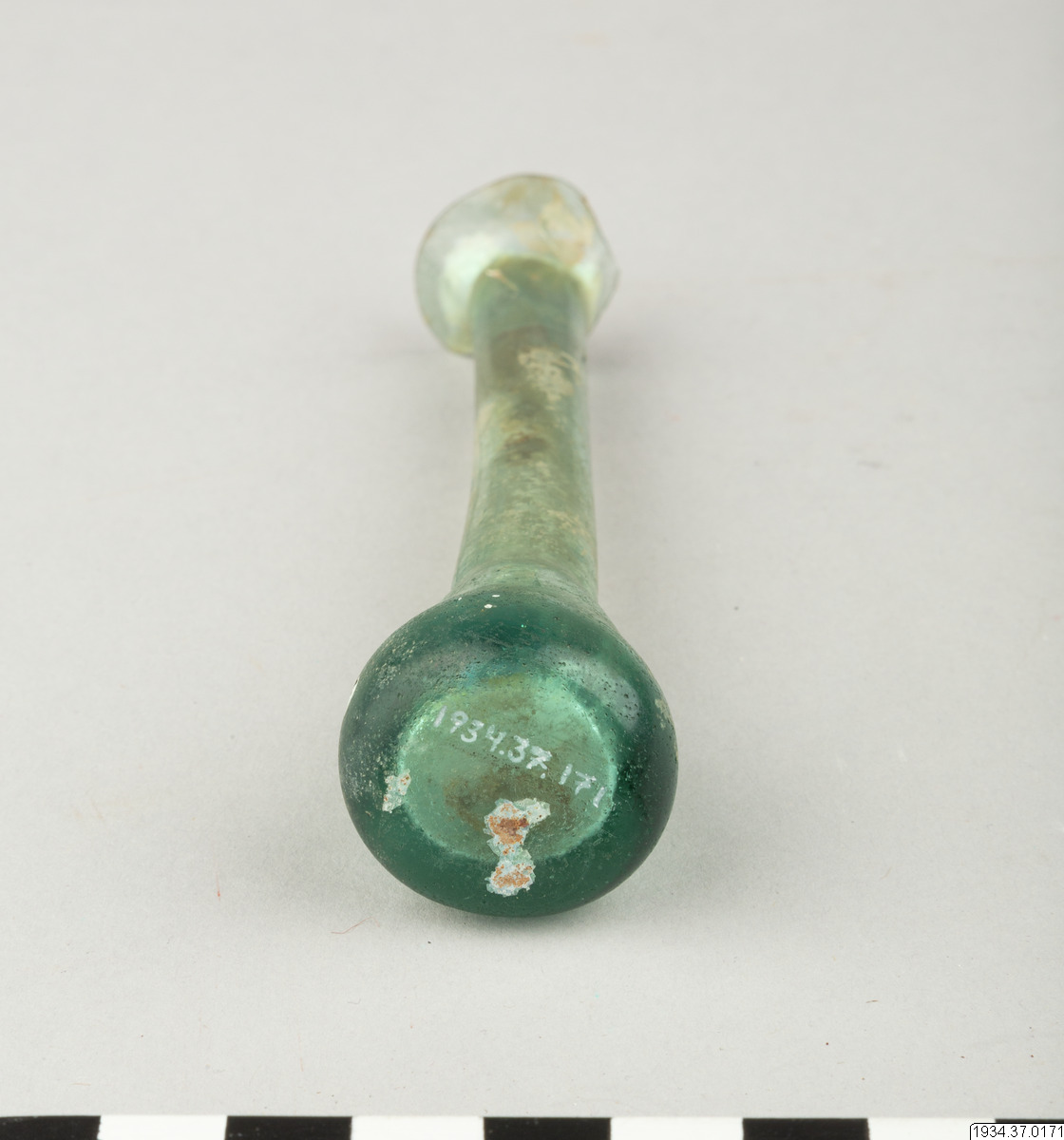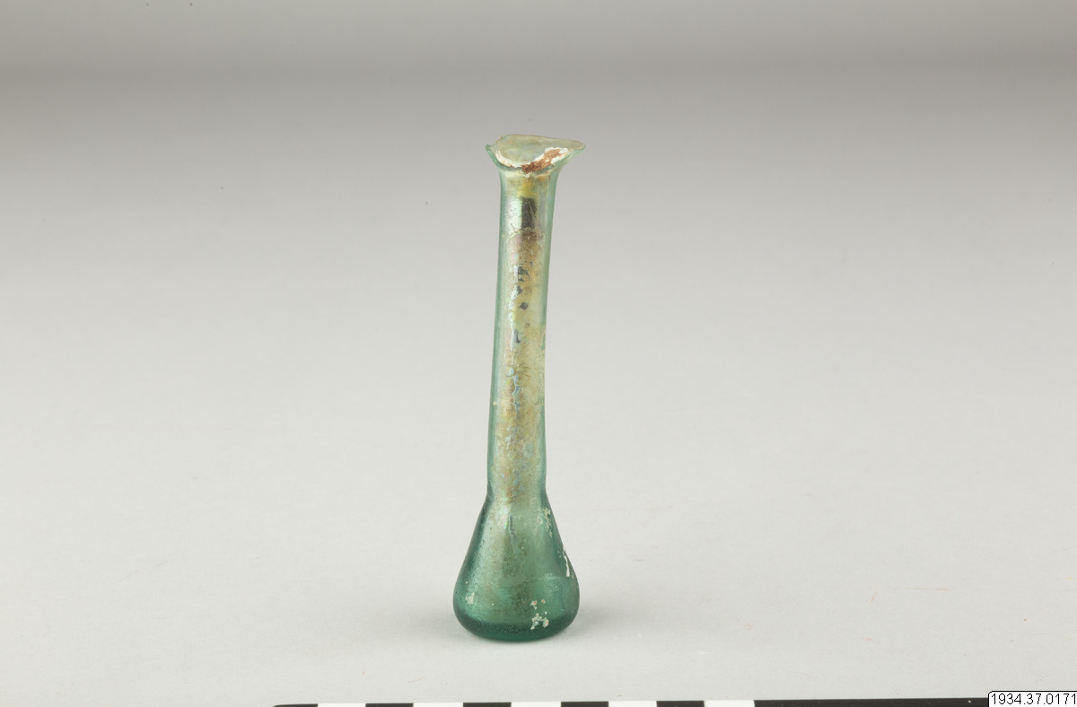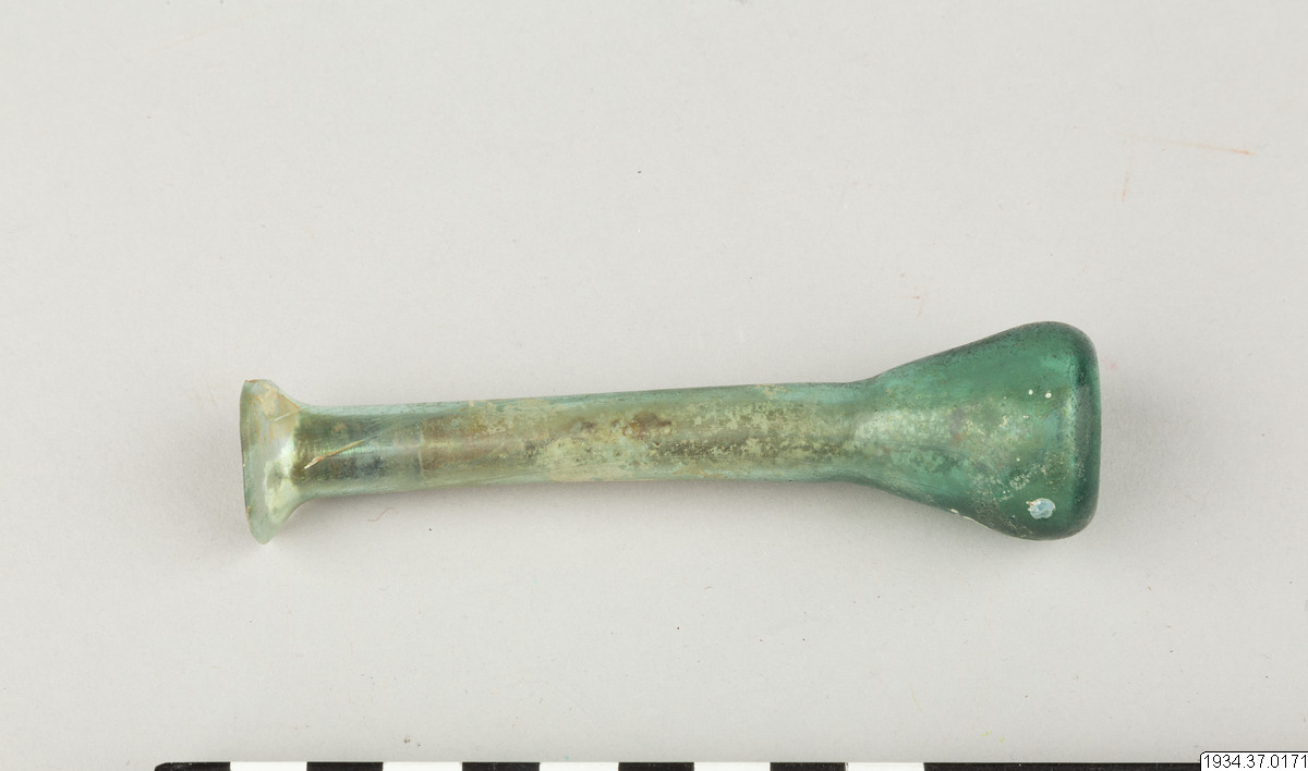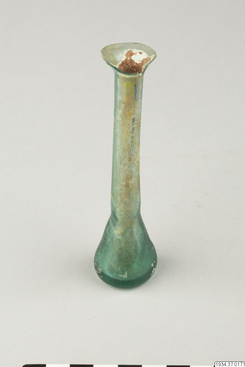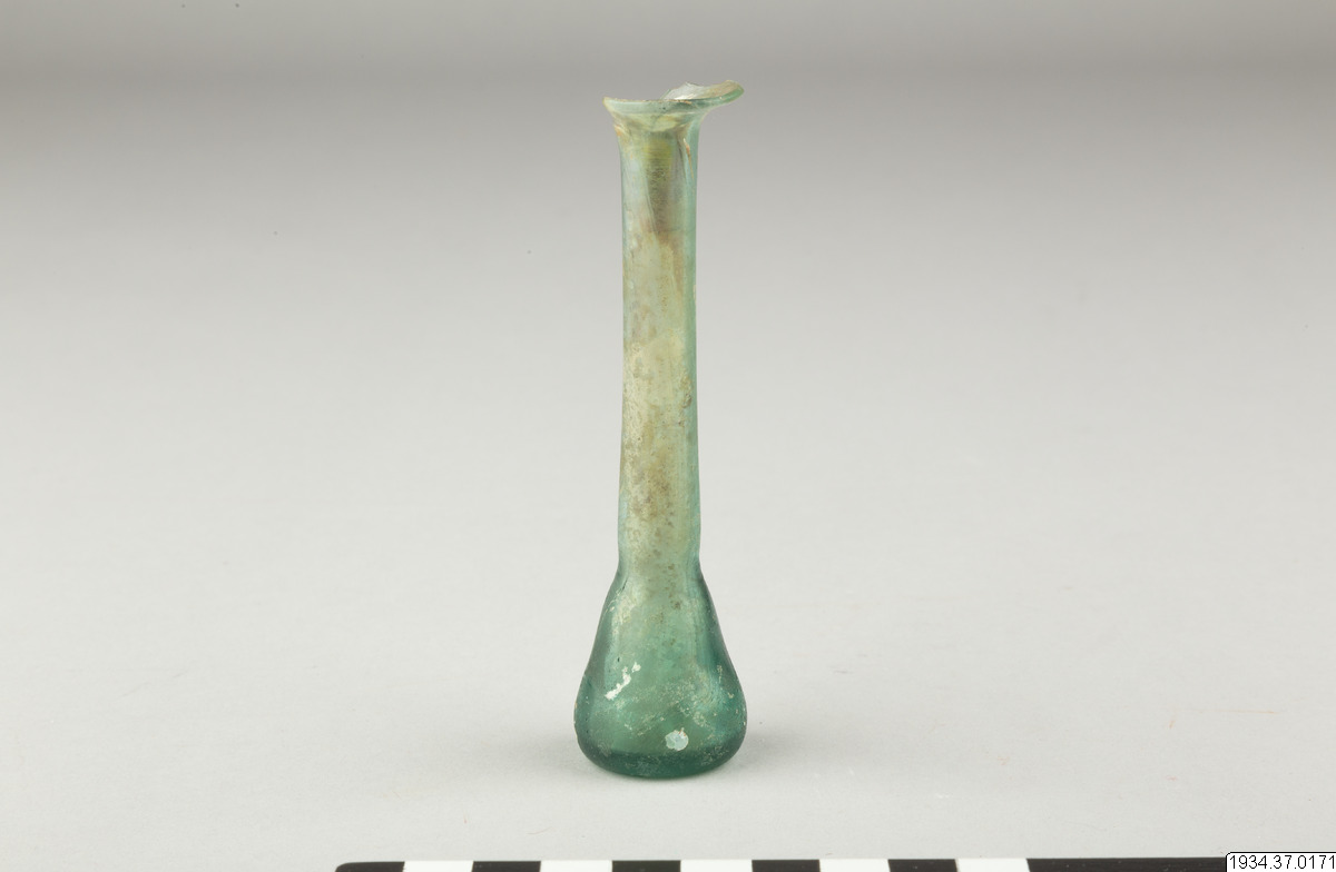 - Romerskt unguentarium (benämnt som "tårglas" i katalog, se anmärkning) av blågrönt glas. Mycket kort, päronformad kropp med hög smal hals. Mycket vid och utsvängd mynning (ungefär till hälften avslagen).