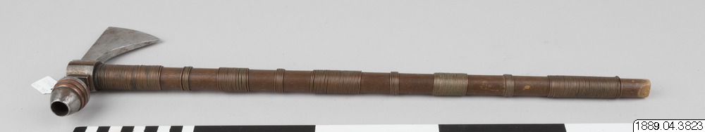 - Tomahawk, stridsyxa, av trä. Skaftet delvis lindat med koppartråd, genomborrat för att användas som pipskaft. Huvud inlagt med koppar, hammaren utgör en tobakspipa. (Enligt generalkatalogen).