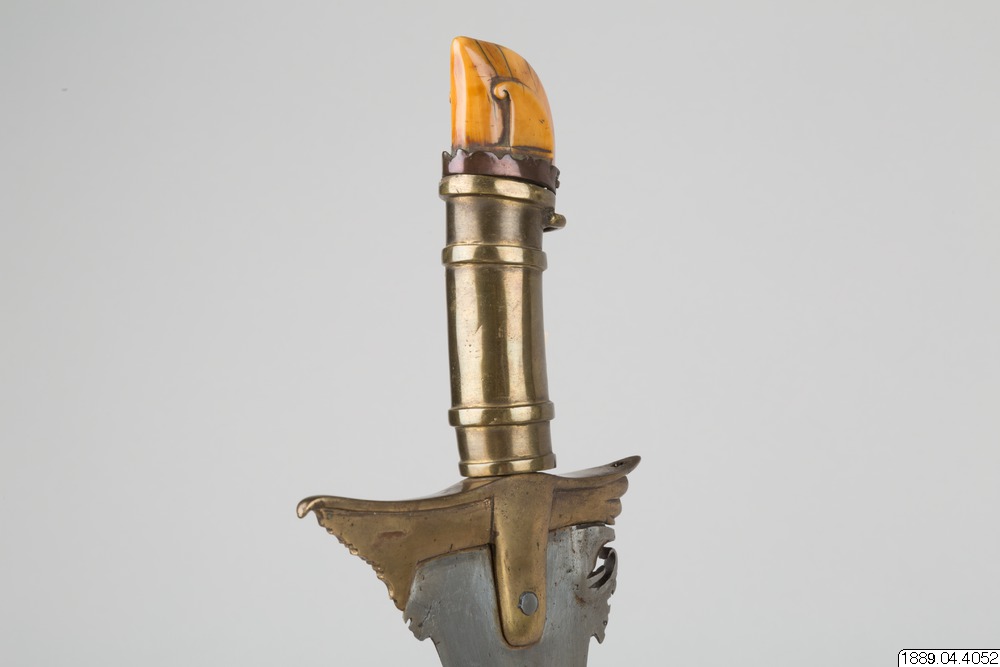 Denna kris har en klinga av damaskerat stål, vid fästet en fördjupning och två korta räfflor. Klinga av stål, rak med vågformig egg. Fäste av mässing med knapp av gulaktigt horn. Kristen har en tillhörande skidan med no. 1889.04.4053.