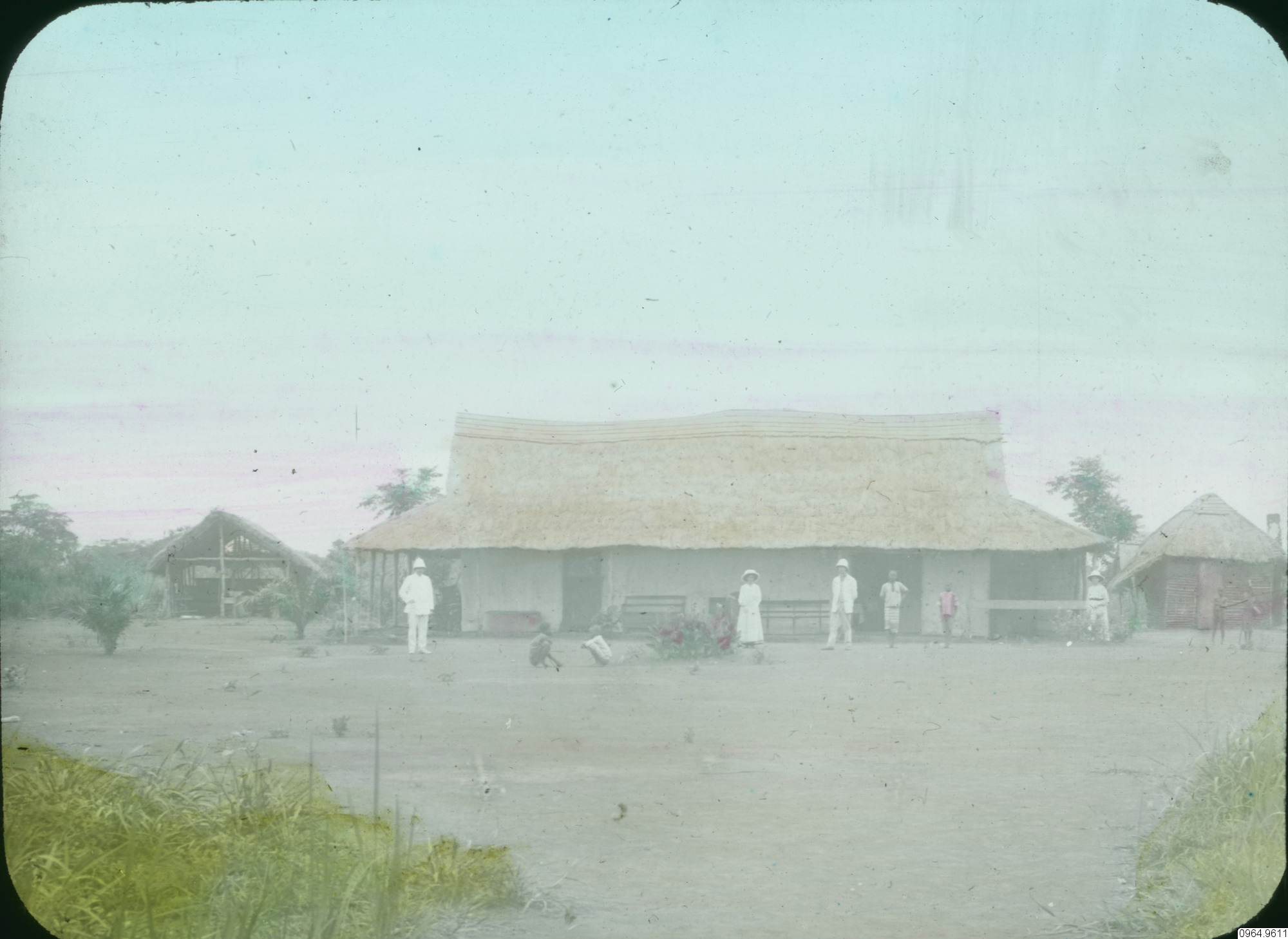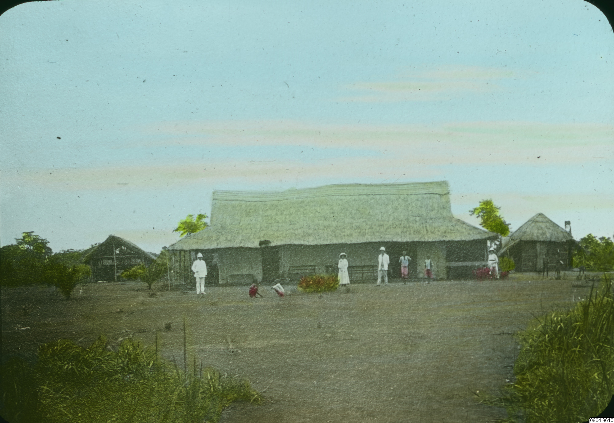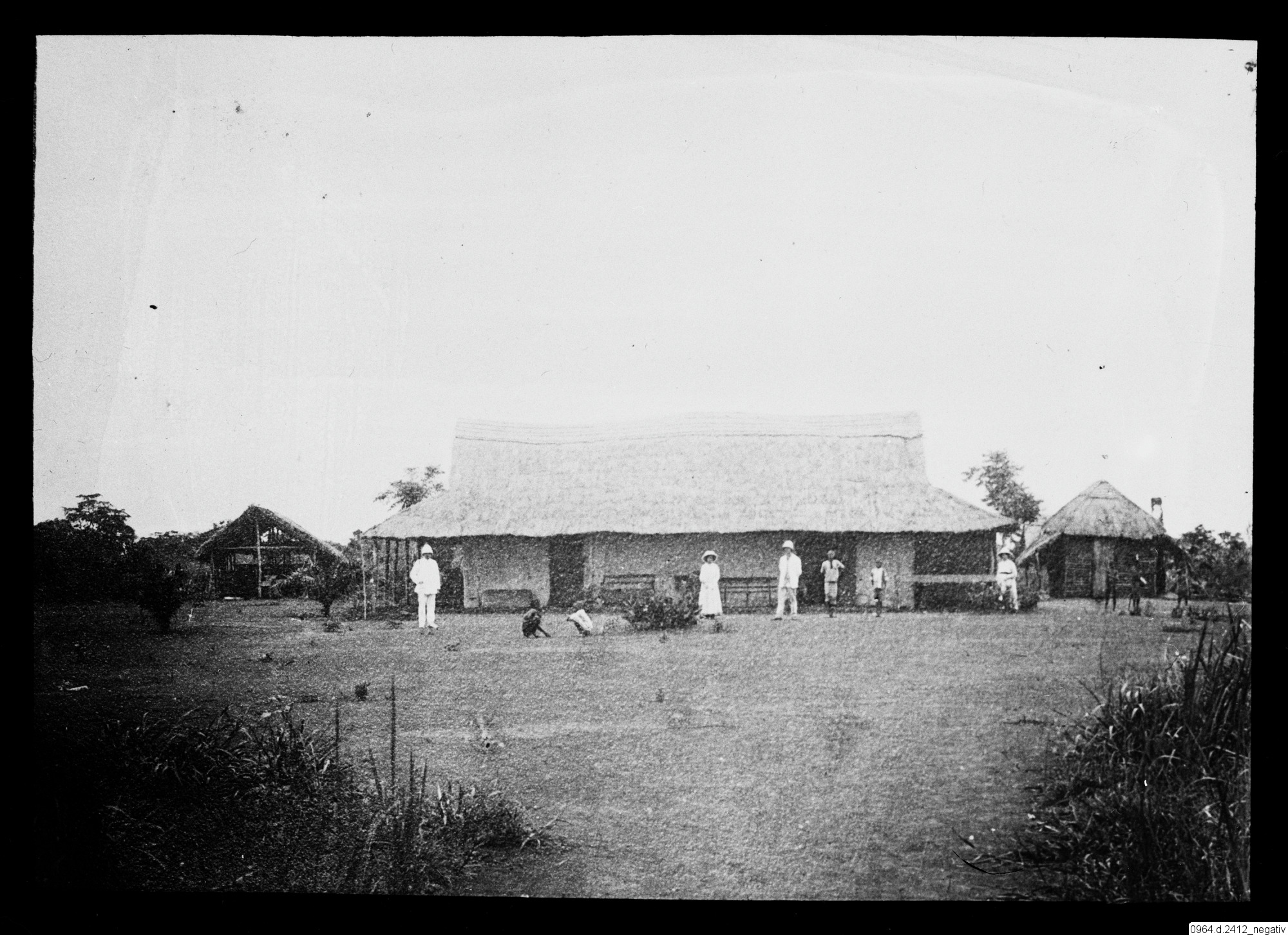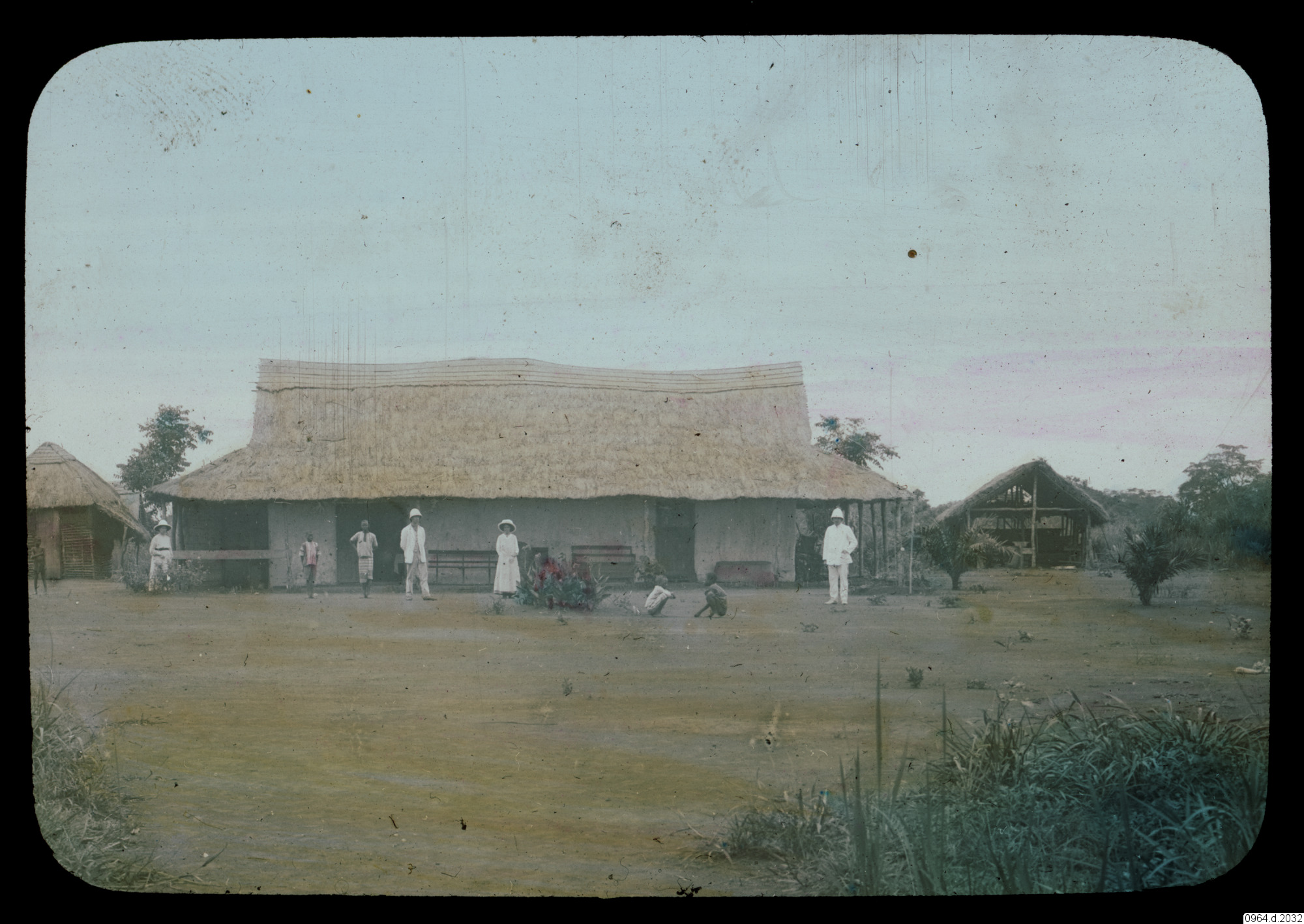 byggnad, hus, gräs, missionärer, träd, missionär, barn, missionsstation, personer, tropikhjälm, gruppbild