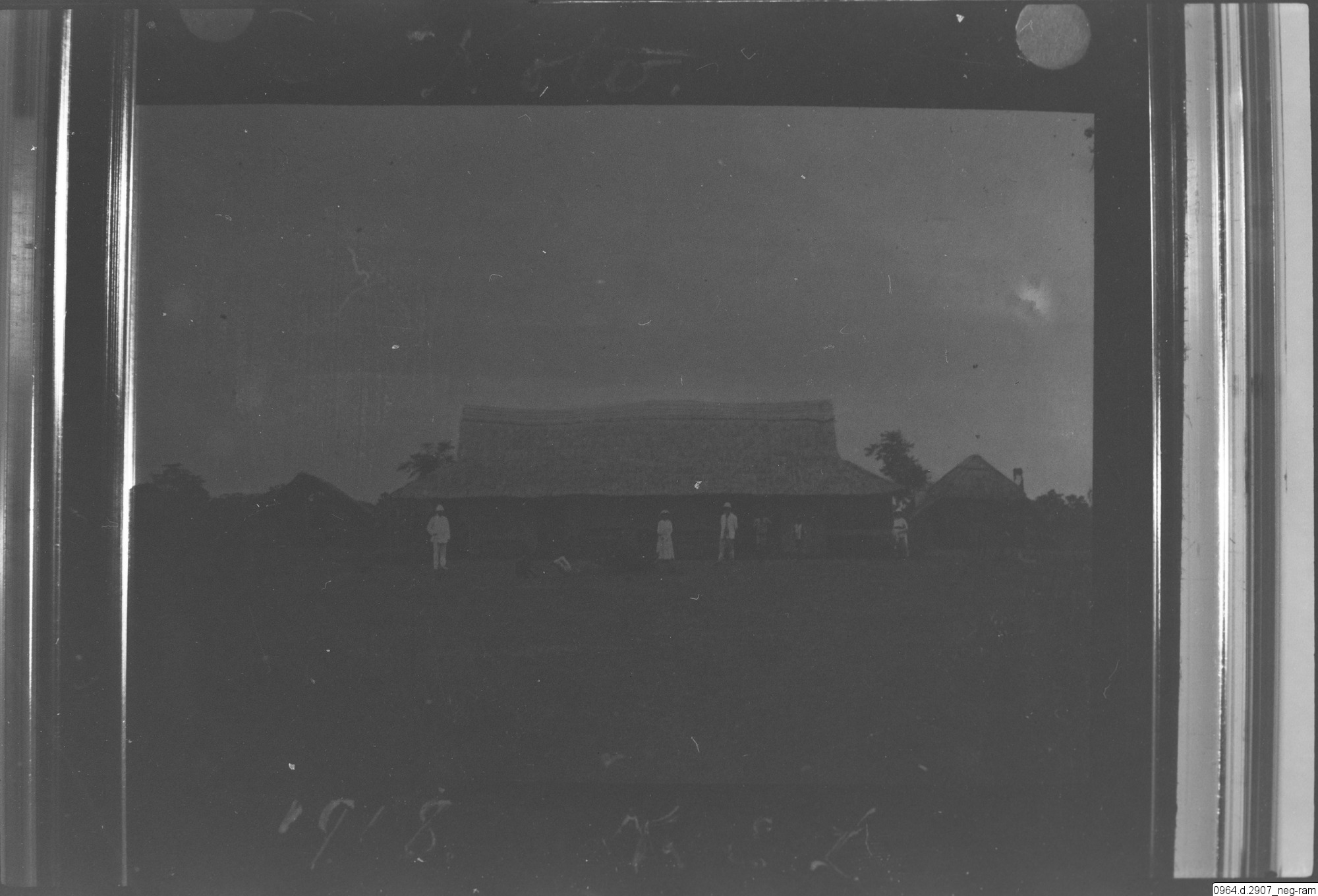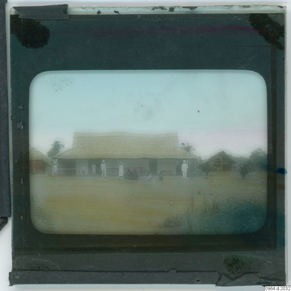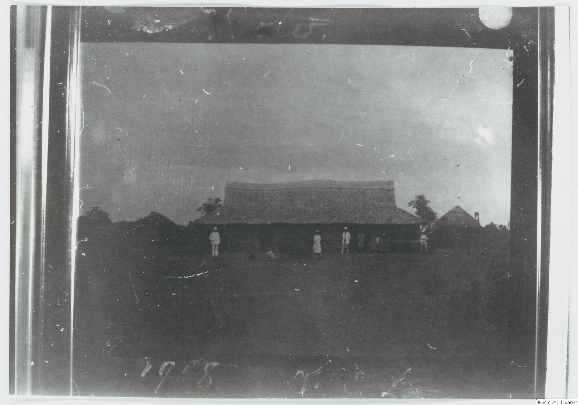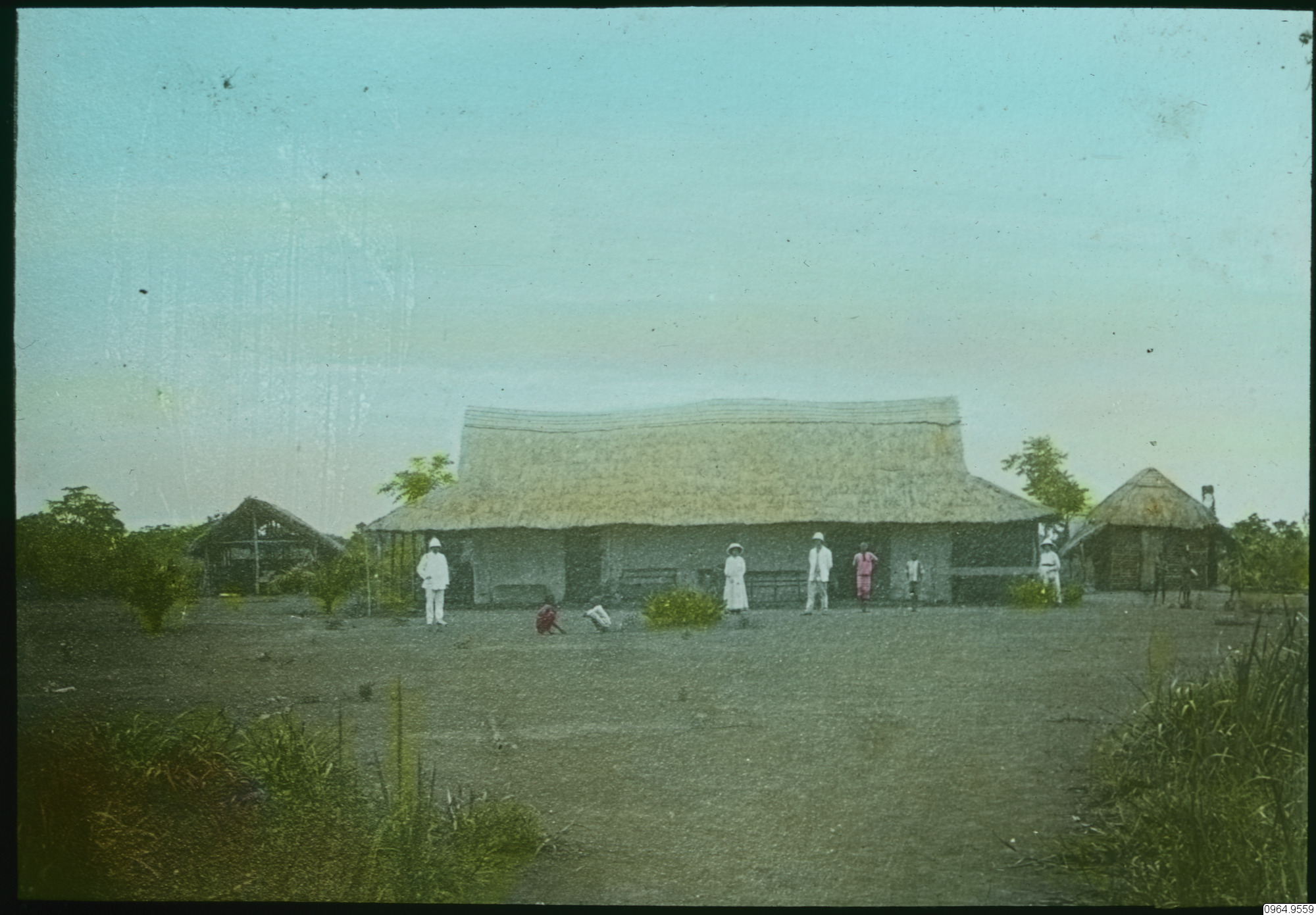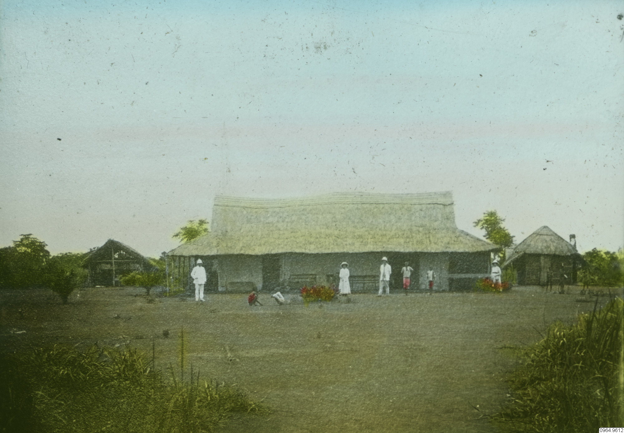byggnad, hus, gräs, missionärer, träd, missionär, barn, missionsstation, personer, tropikhjälm, gruppbild