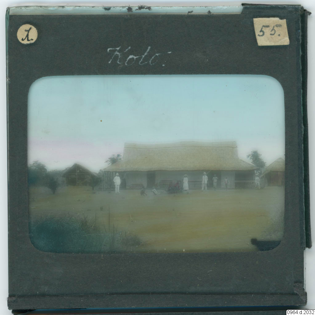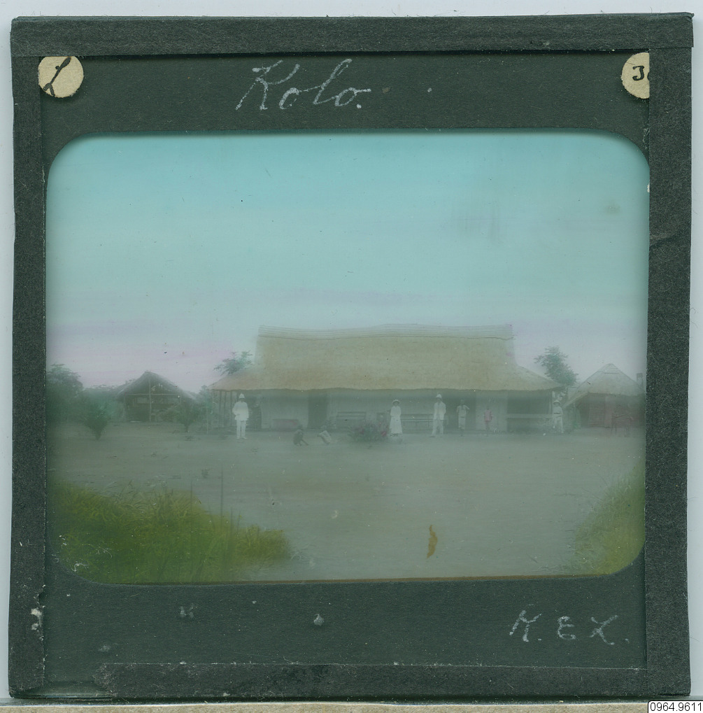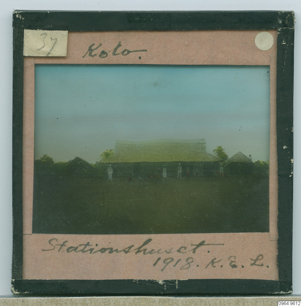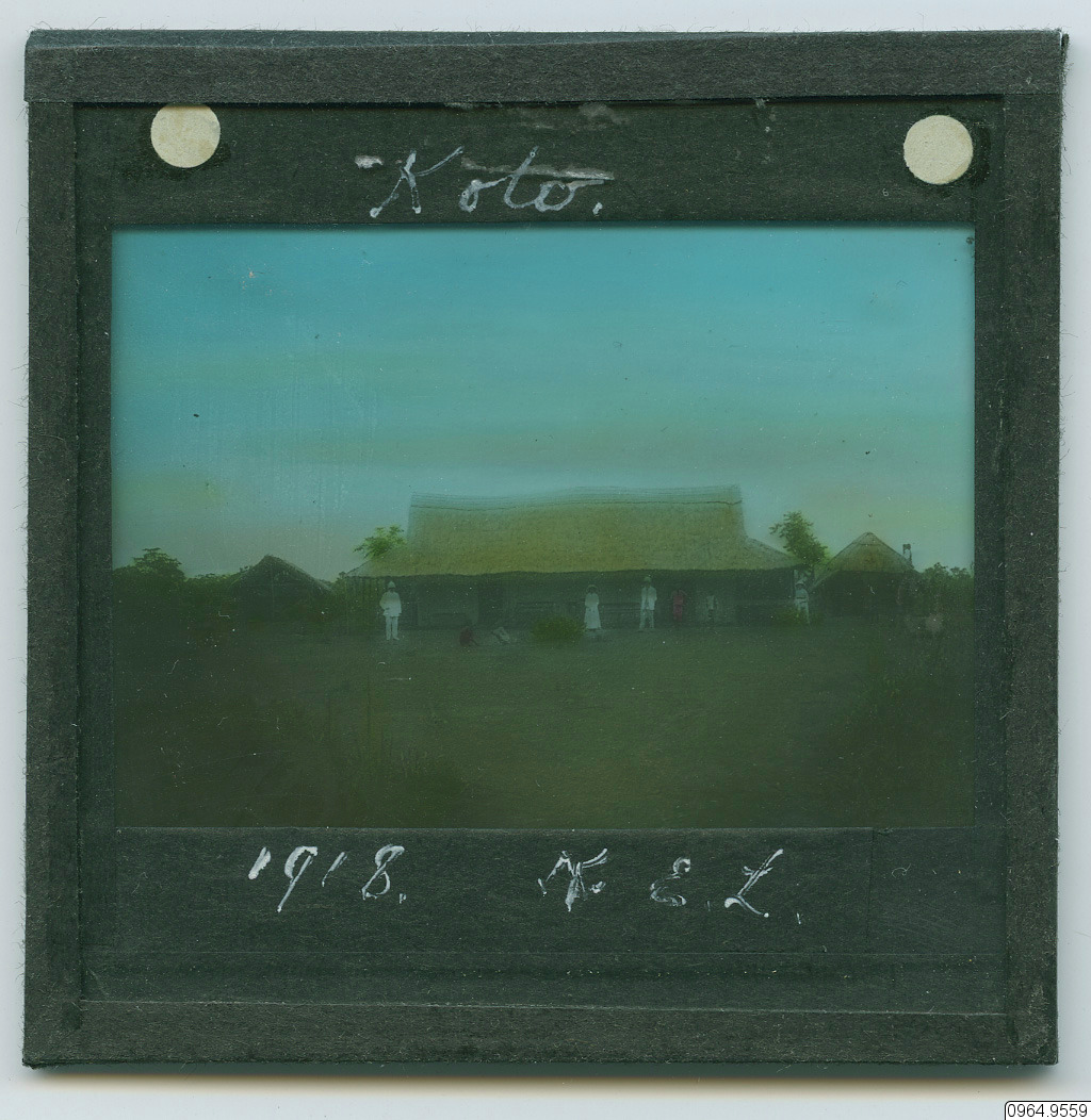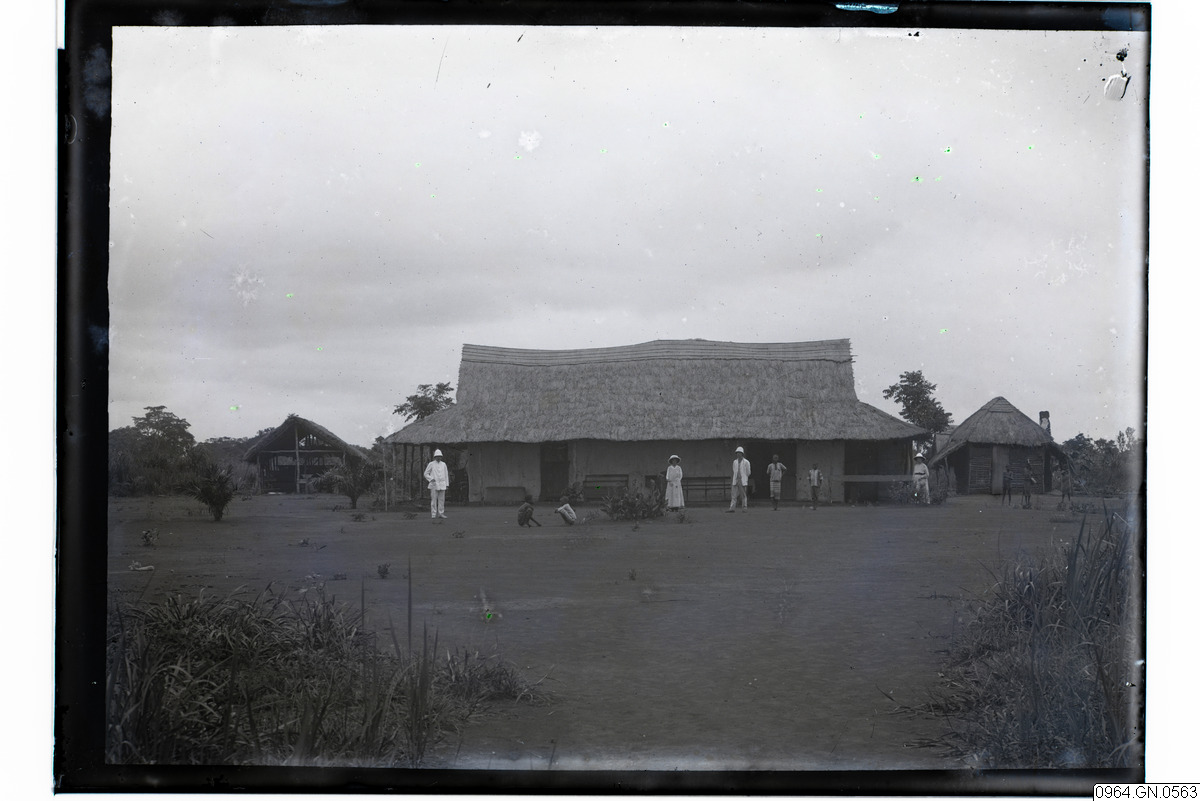 byggnad, hus, gräs, missionärer, träd, missionär, barn, missionsstation, personer, tropikhjälm, gruppbild