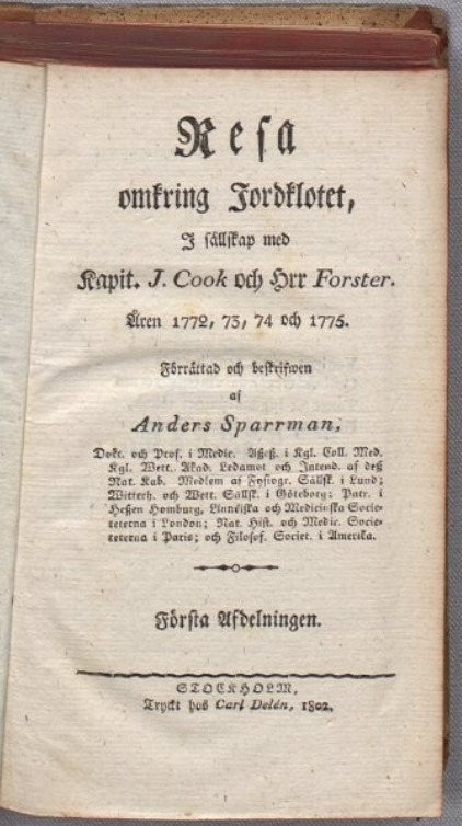 Sparrman, Anders (1802) Resa omkring jordklotet, i sällskap Cook och Forster. Vol. 1.