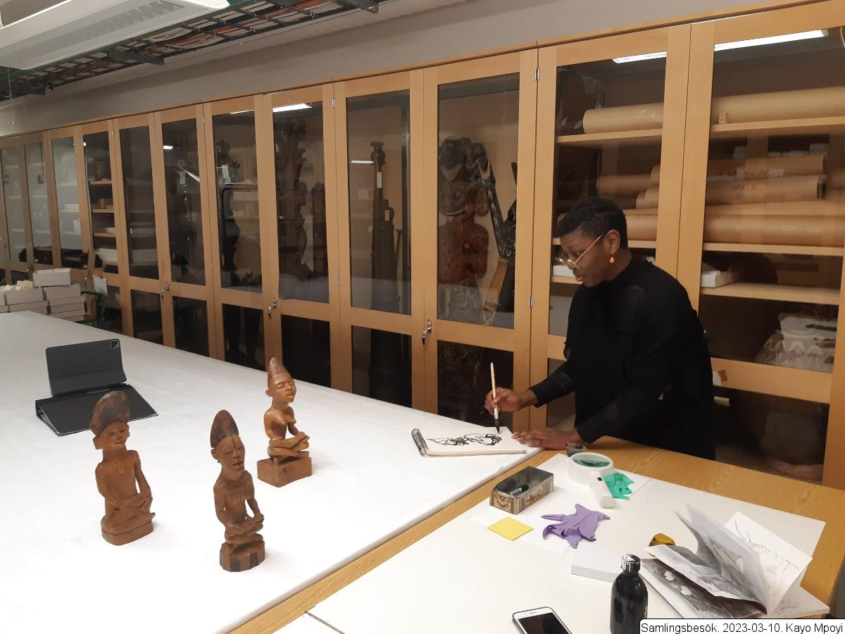 - Kayo Mpoyi undersöker föremål från Centralafrika, särskilt Kongo-Kinshasa. För att lära känna konstnärerna tecknade KM till en början av ett antal skulpturer, för att sedan övergå till tuschmålning.